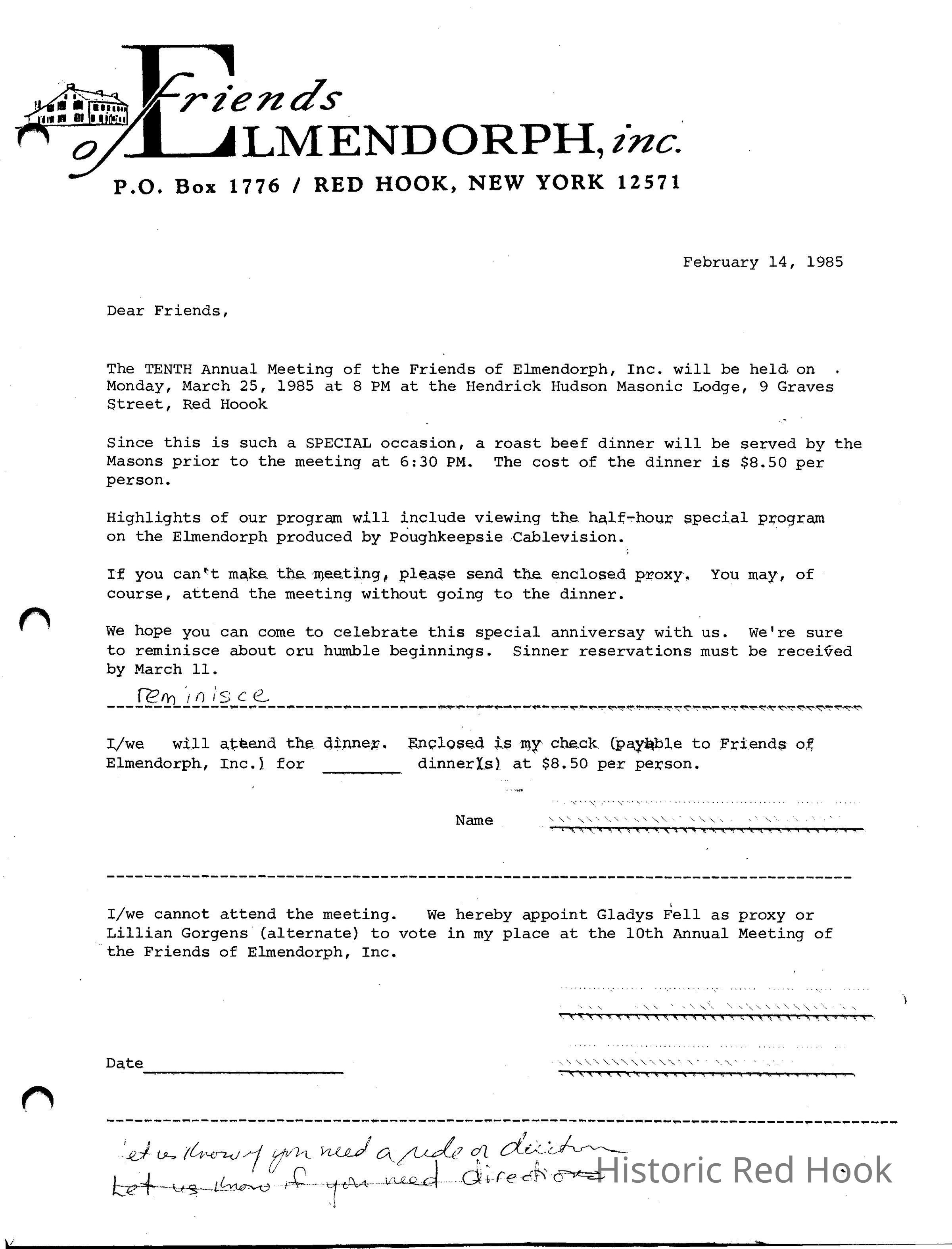 Friends of Elmendorph 10th Annual Meeting letter, February 1985. Held at the Hendrick Hudson Masonic Lodge, Red Hook.Relationships