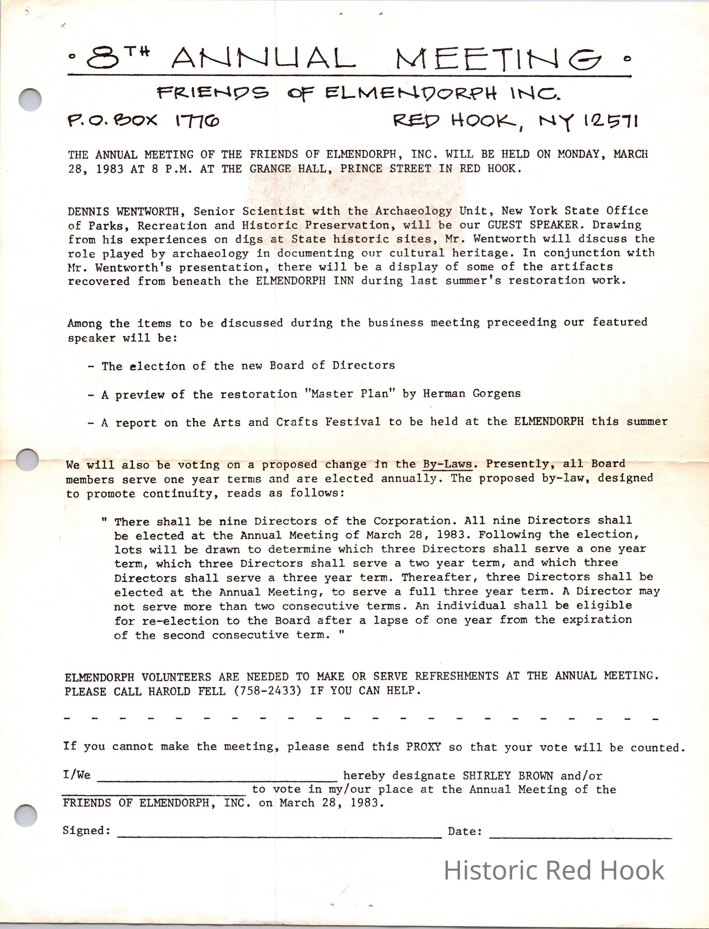 Friends of Elmendorph 8th Annual Meeting notice, 1983. Meeting was held at the Grange Hall in Red Hook.Relationships