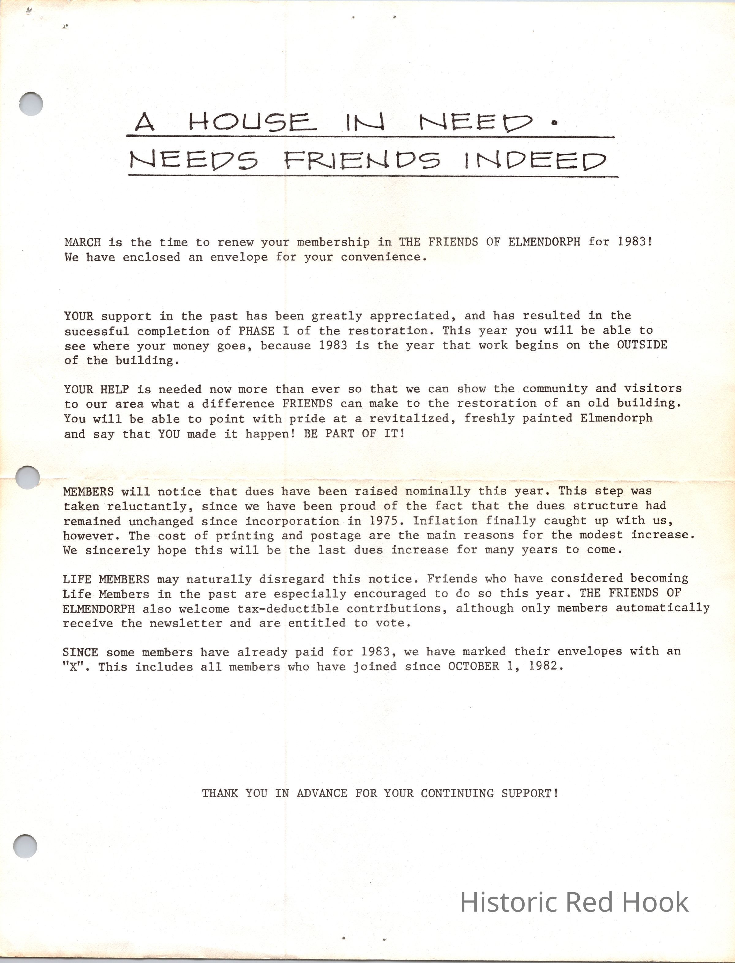 Friends of Elmendorph Membership renewal letter of March 1983