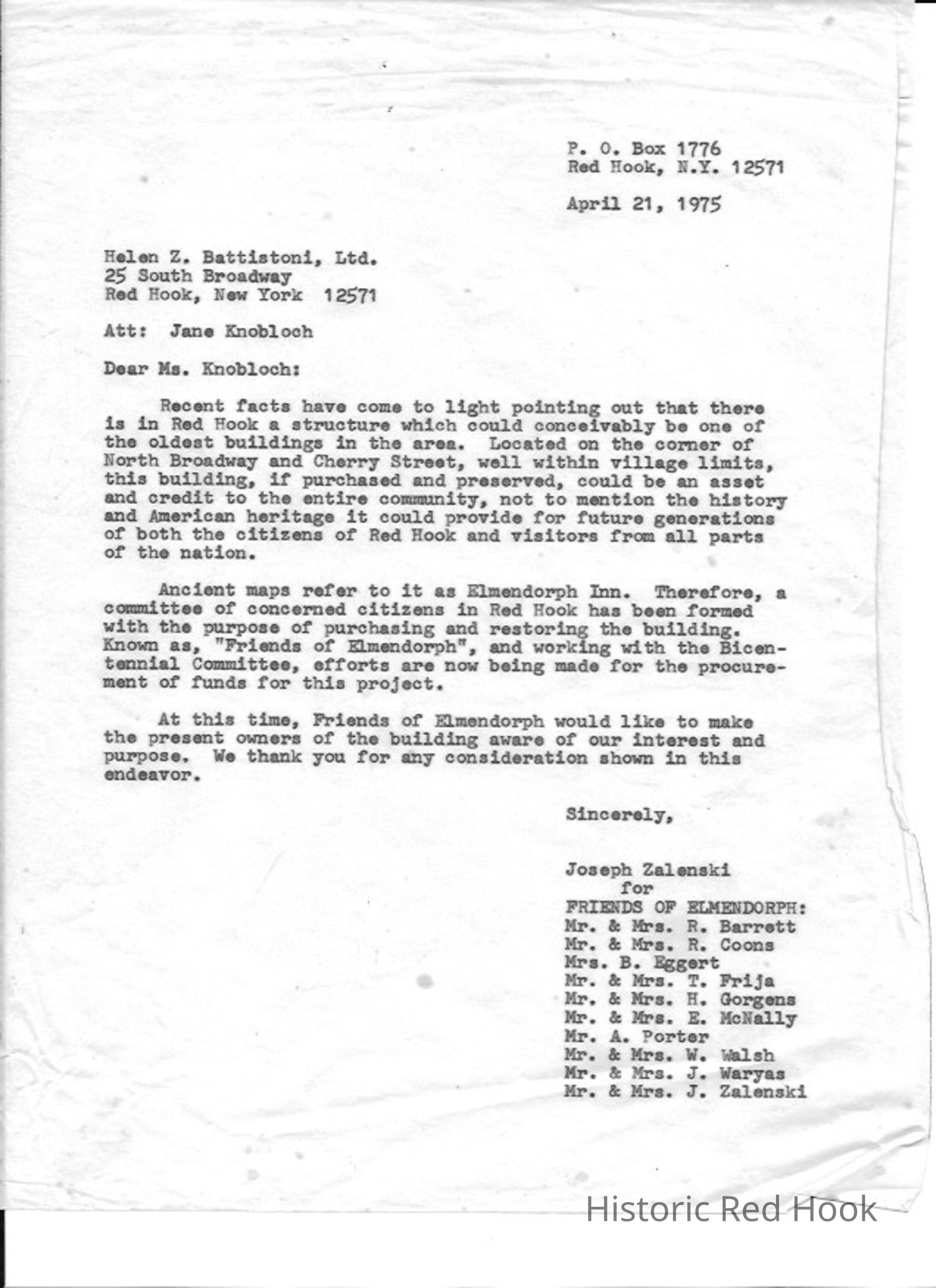 April 21, 1975 letter from Joseph Zalenski representing FOE, to Jane Knobloch at Helen Z. Battistoni's real estate office, about contacting Grand Union to mae them aware of FOE's interest in preserving the Elmendorph Inn.Collection