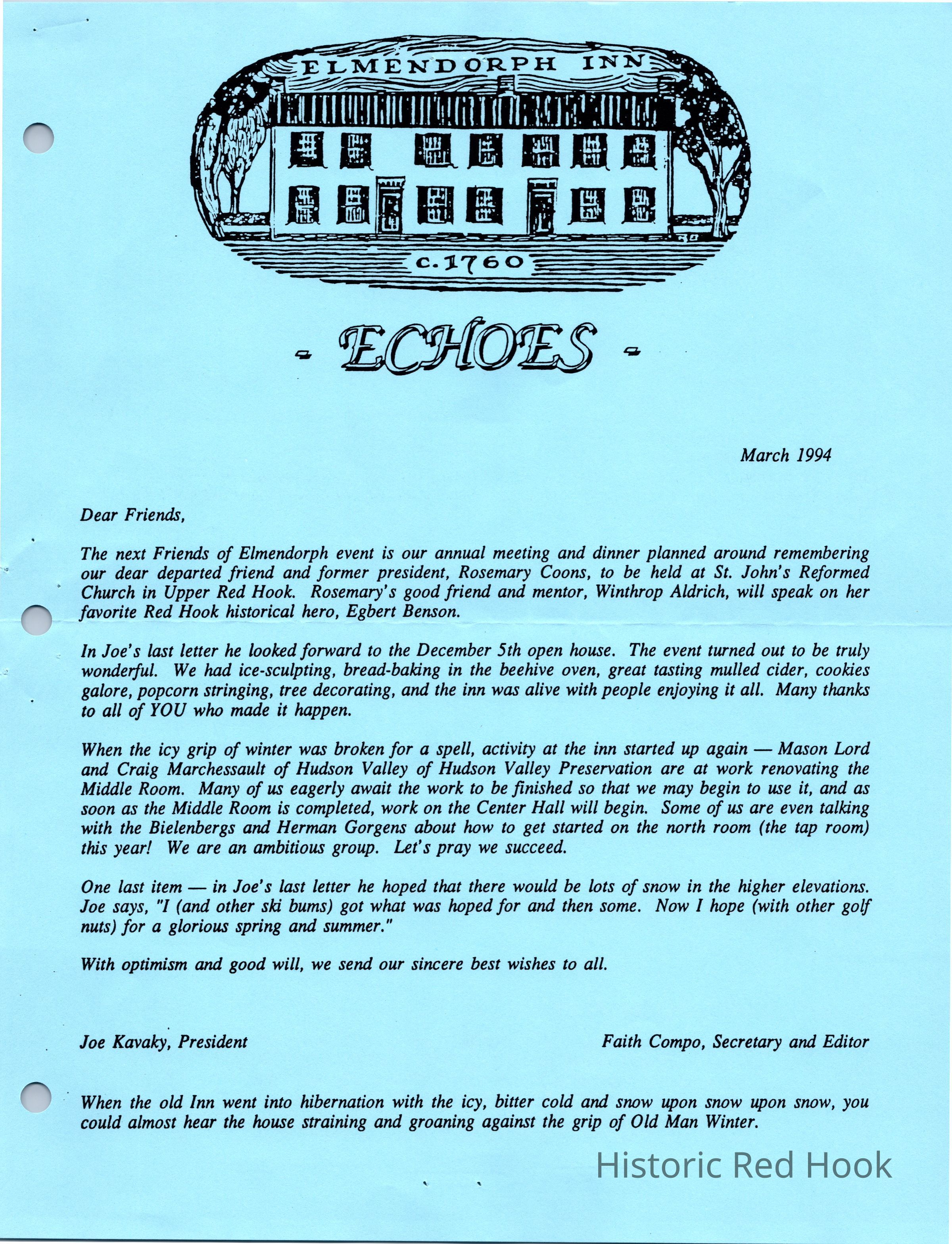 Newsletter created for the membership of the Friends of the Elmendorph.