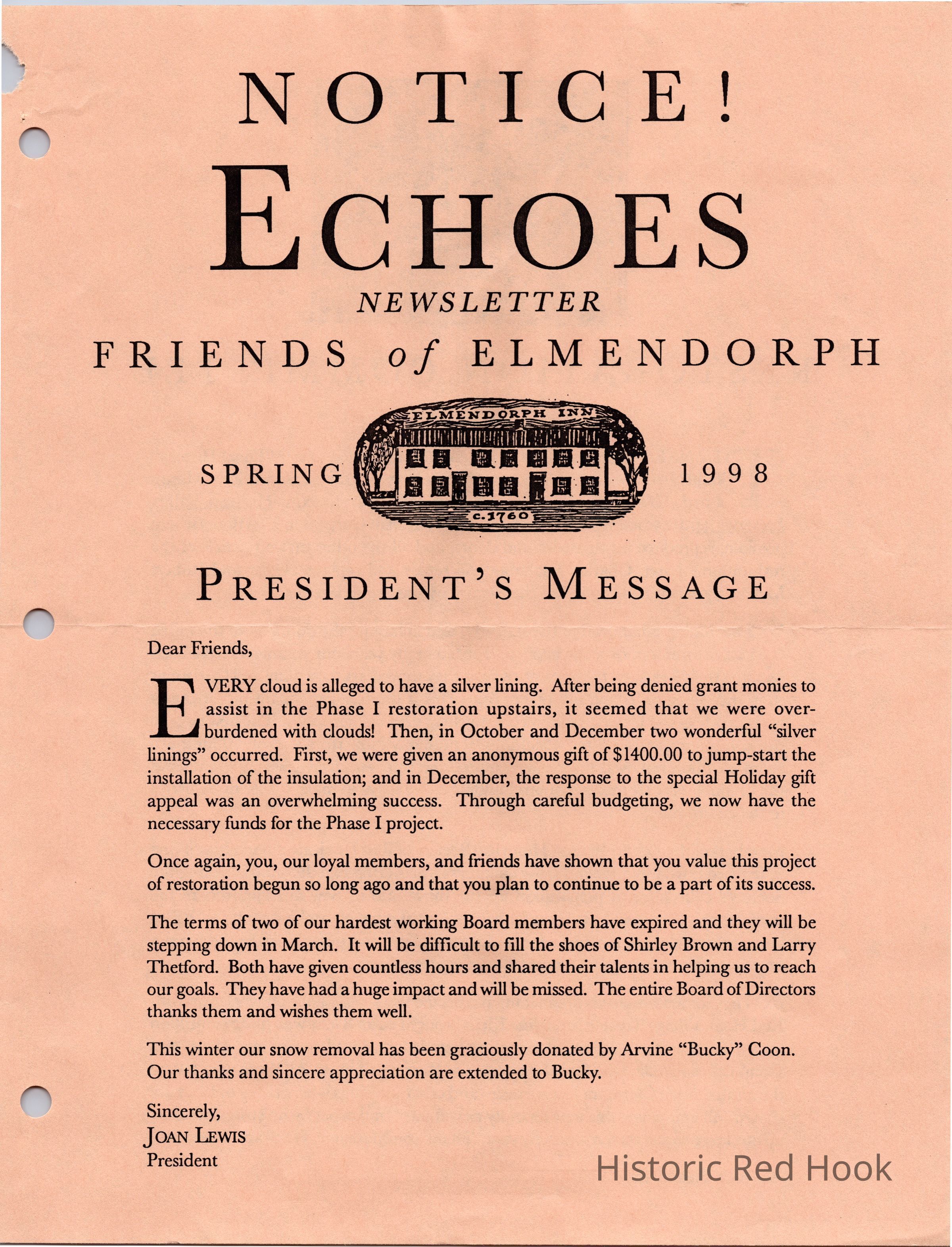 Newsletter created for the membership of the Friends of the Elmendorph.