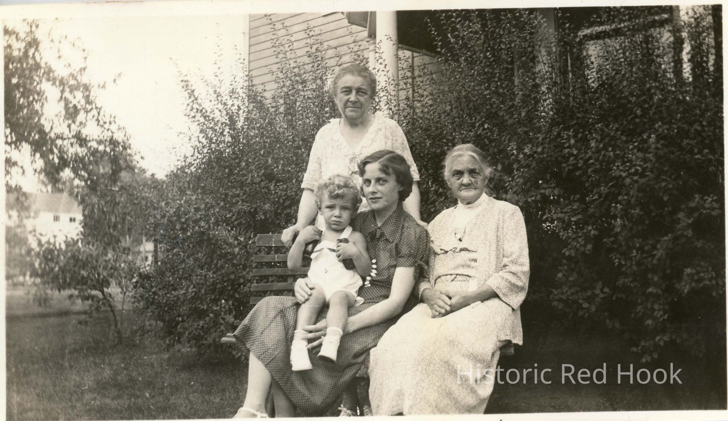 Black and white photograph of a family sitting on a bench: three ladies and a young child.