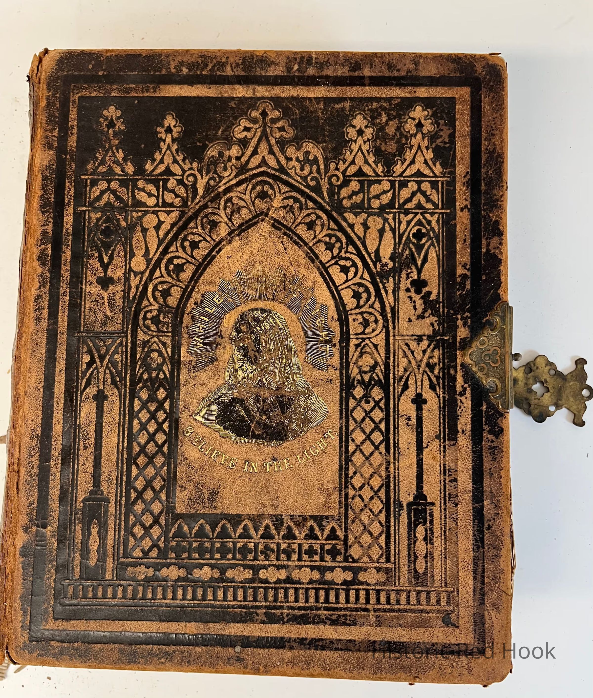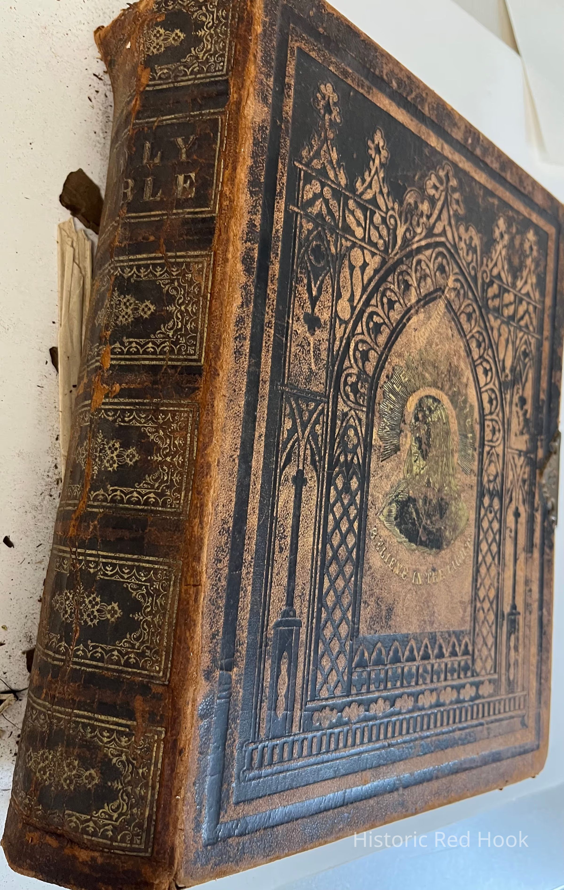Bible, brown cover with black and gold colored detail, metal clasp, undated, in English, very fragile throughout, all pages damaged, mildew scent, spine detached from bound pages, shedding, 3 pages of family record of marriages, births and deaths, 12”L, 10”W, 3” DCollection