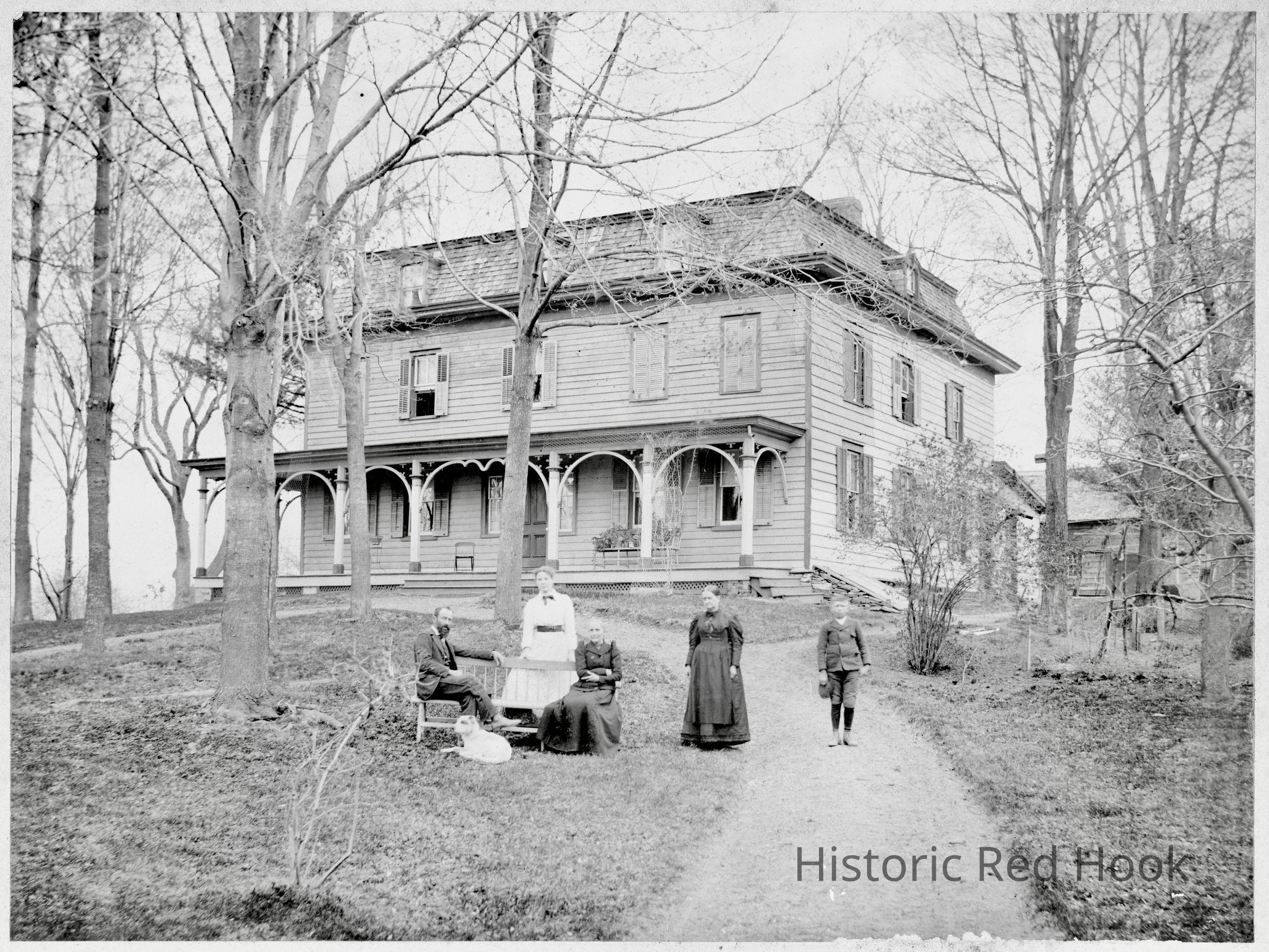 Photo of Rose Hill farmhouse with five family members (John A Fraleigh and Irene sitting, Rosalie M Fraleigh standing behind them, Rose Fraleigh (John's sister) standing by driveway, Herbert Fraleigh on driveway "and dog in front, cardboard, some stains, 14”W, 11” L. Same image as 2015.014.035. c 1890-1900.Photograph Details