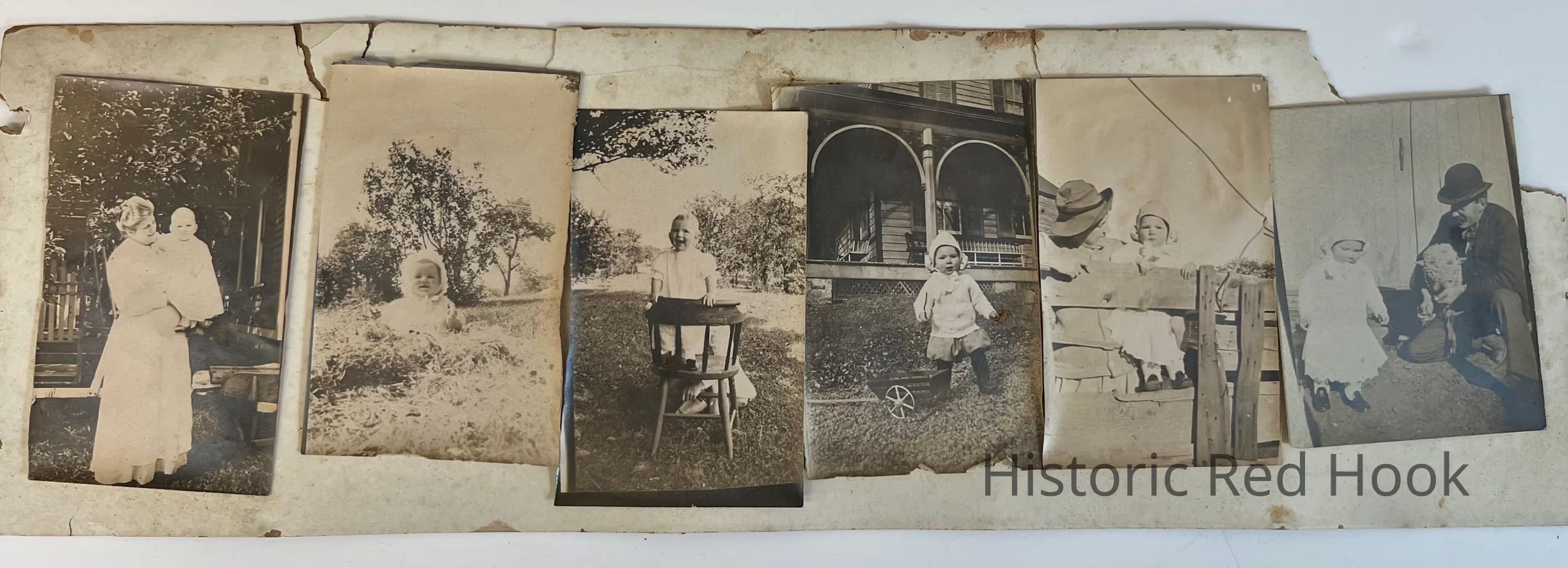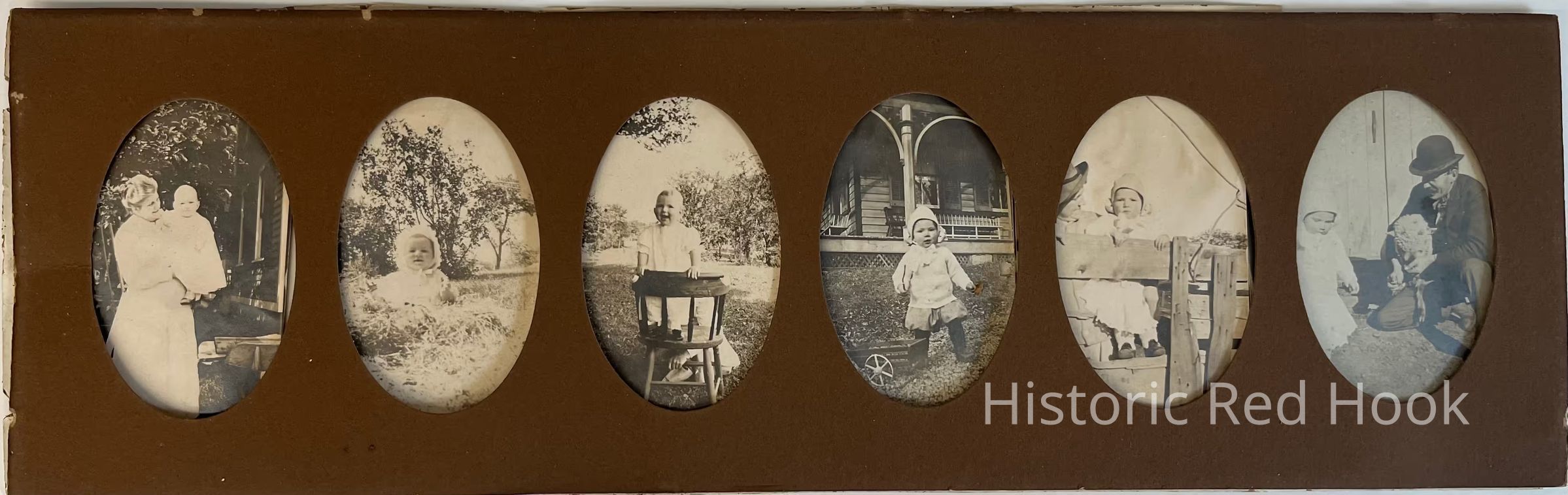 Six Fraleigh family photos - each includes a baby, two also include adults, set in heavy brown paper frame, 16”W and 5” LPhotograph Details