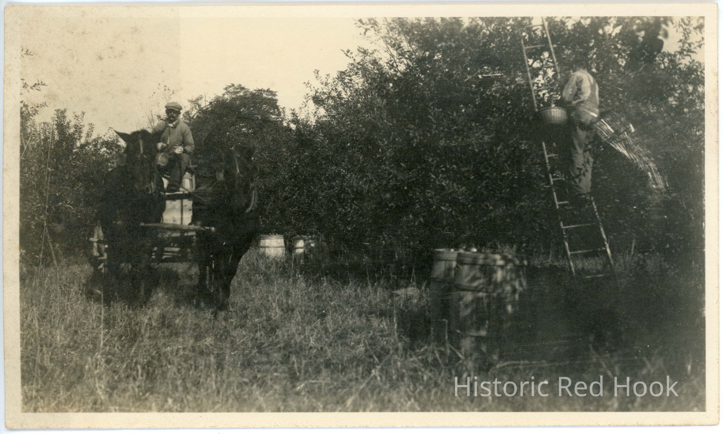 Fred Stall is driving the horse and wagon in the apple orchard.