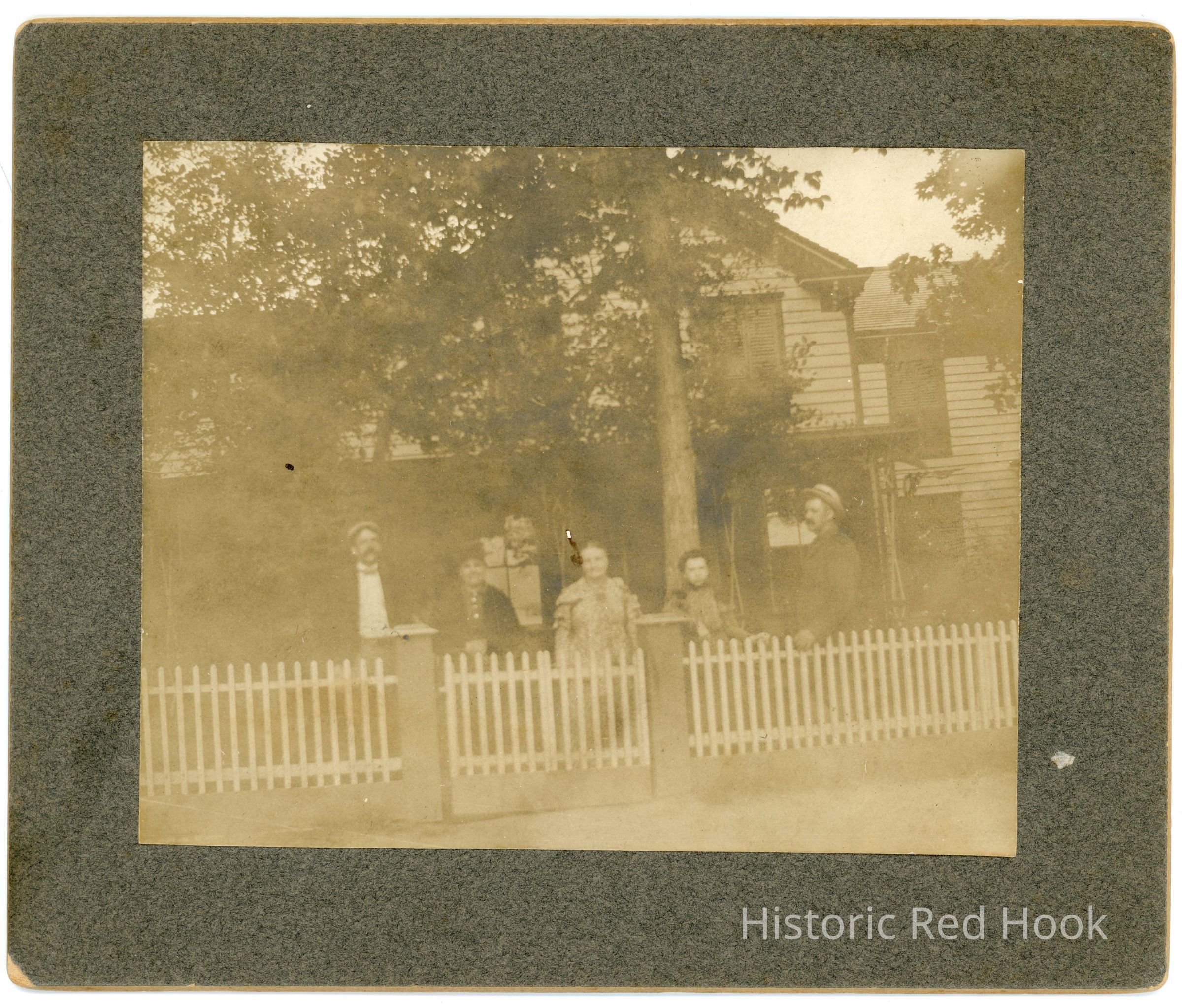 photo of 2 men and 3 women in front of house with picket fence