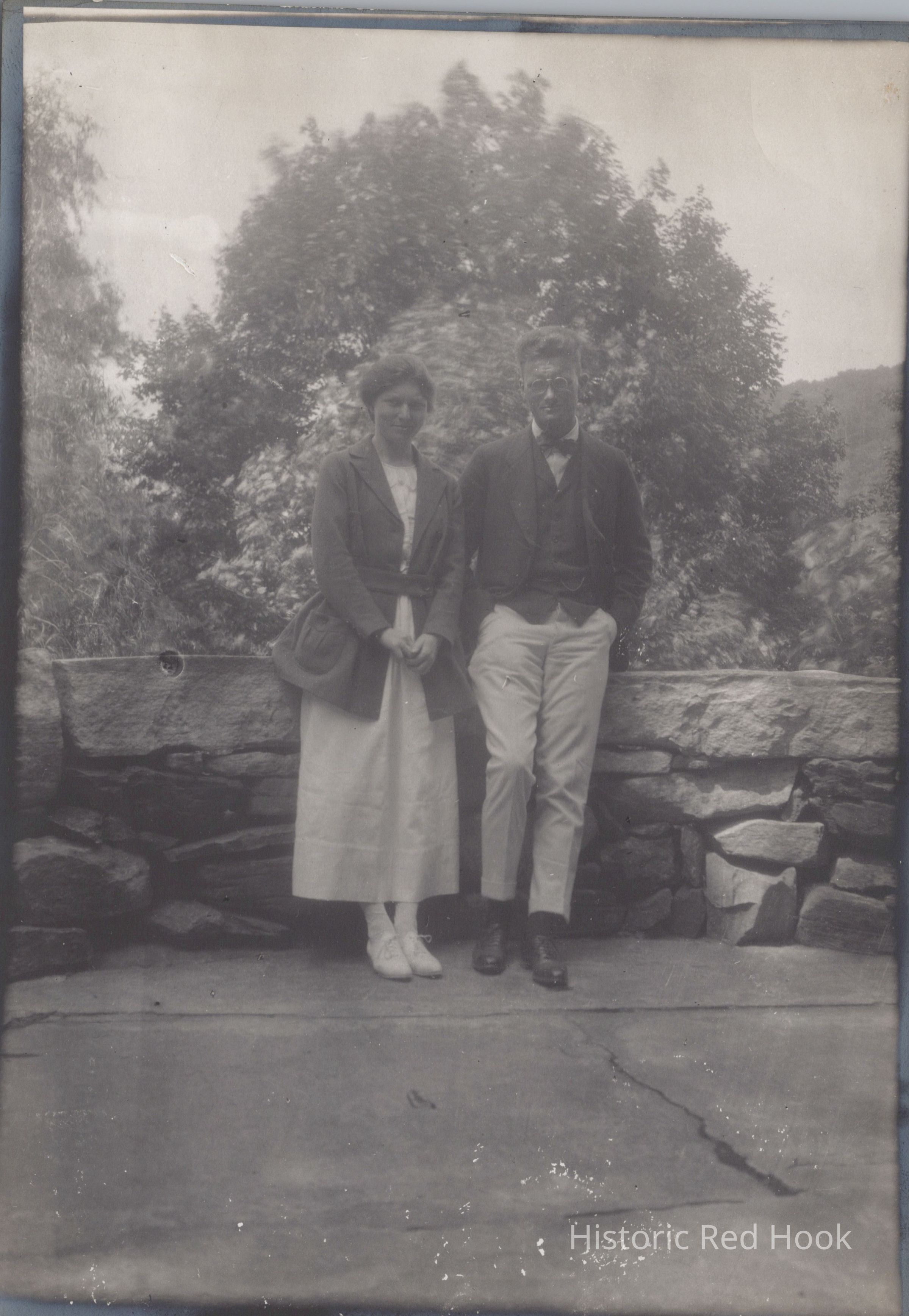 G. Gordon Mead and Fay Mead leaning against a stone wall at the Mead House at Lake Waramaug