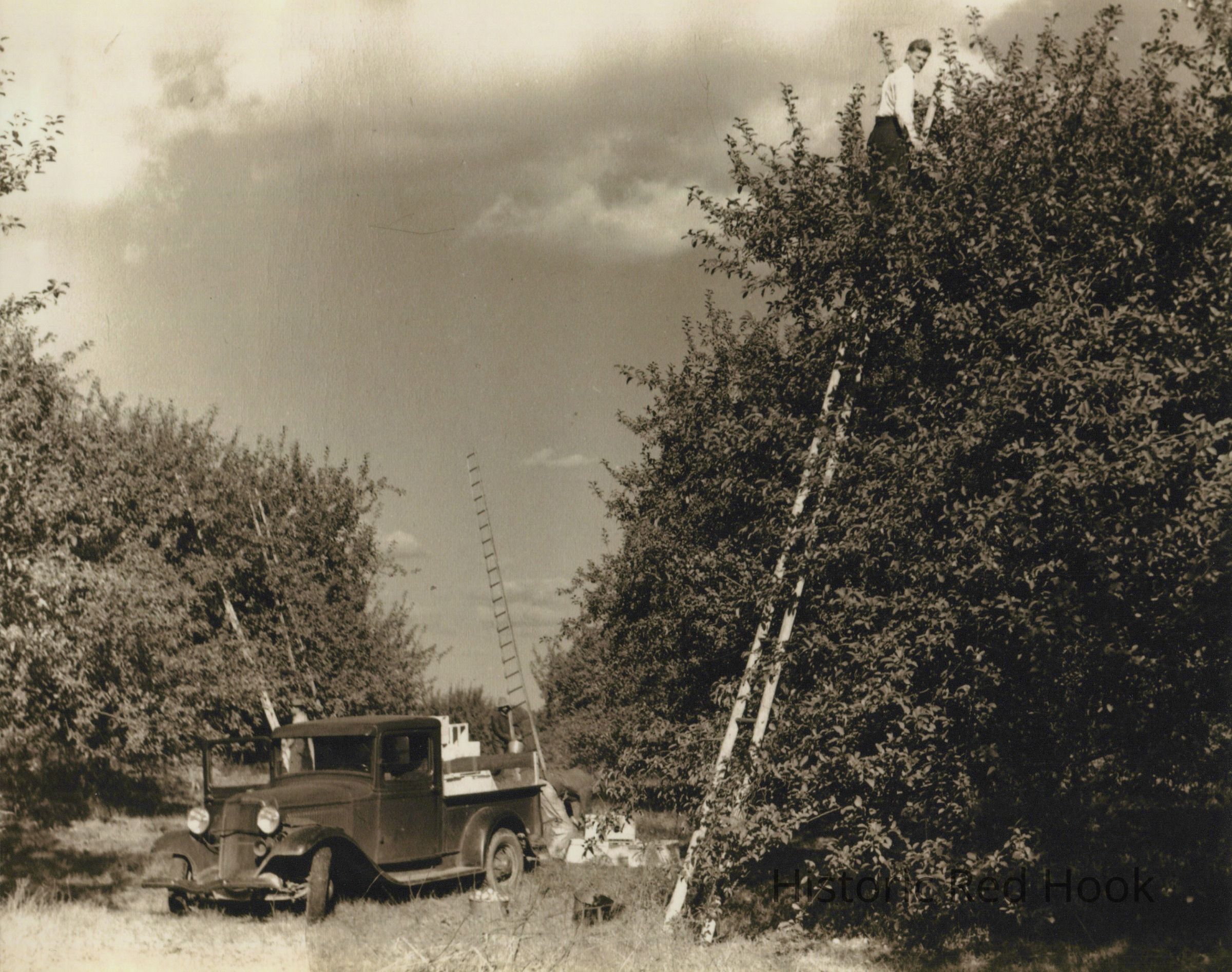 G. Gordon Mead on top of a 30-foot ladder harvesting apples with his Ford Model B, c. 1947, below.Photograph Details