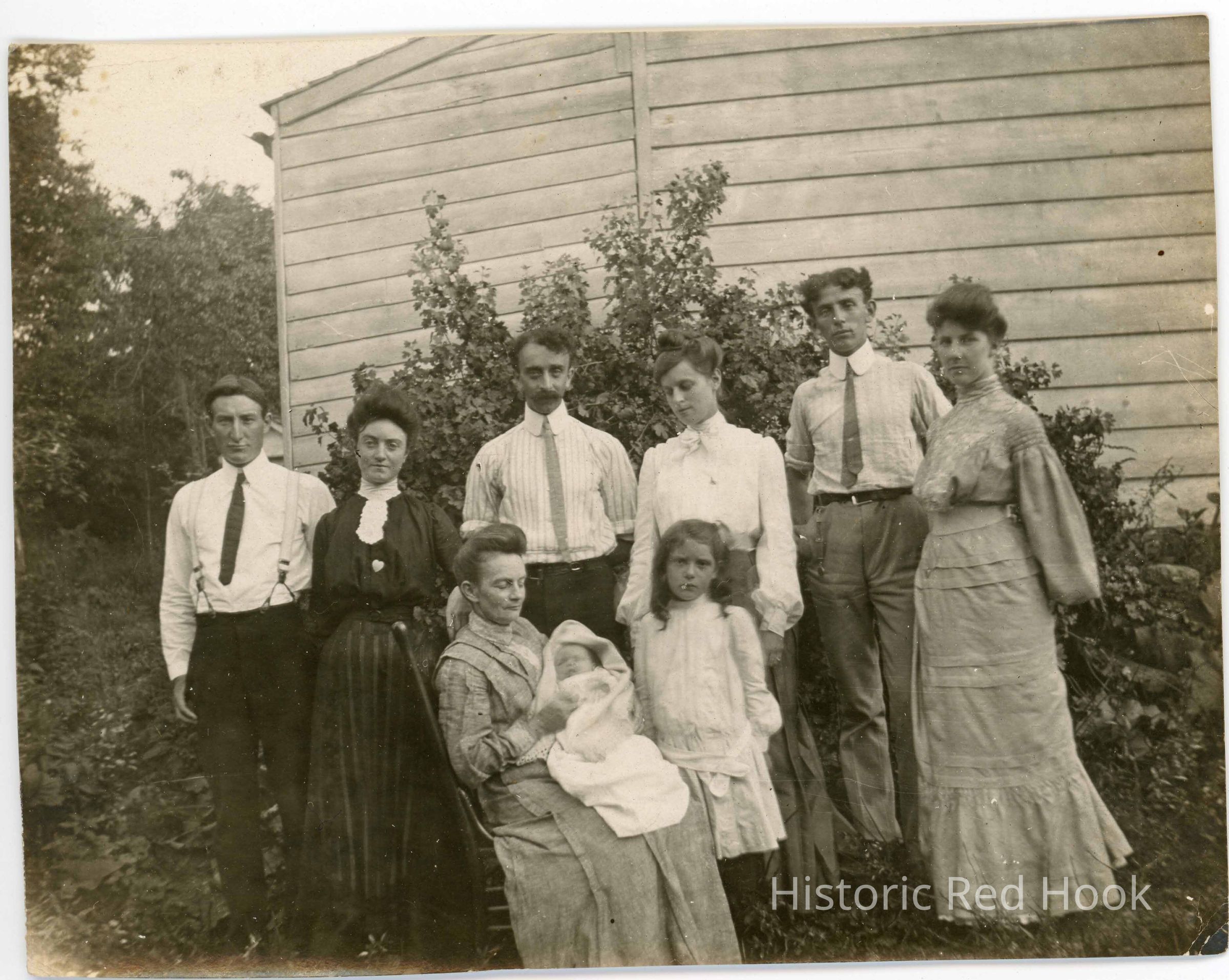Outdoor photograph of men, women, and children on a lawn near a building. One woman is seated and holding and infant.