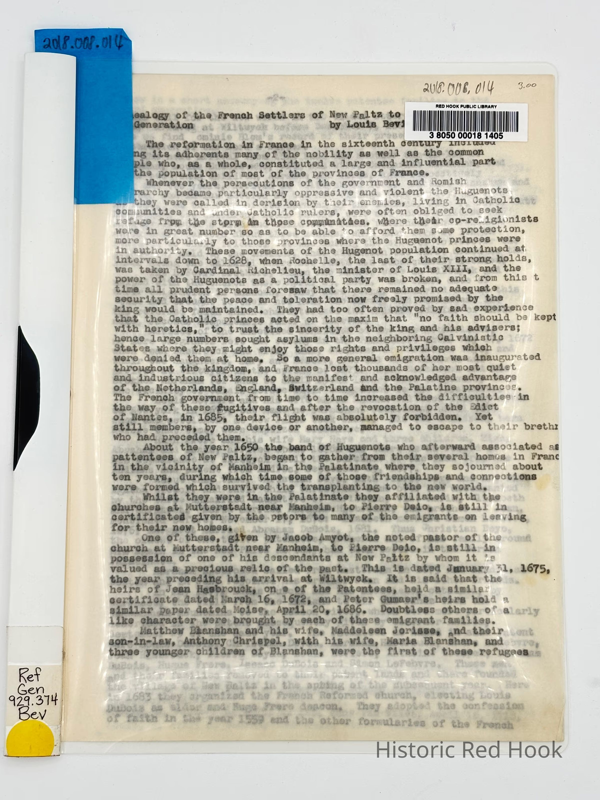 A thin typewritten record which starts with European historical background and description of emigration eventually to New Paltz.