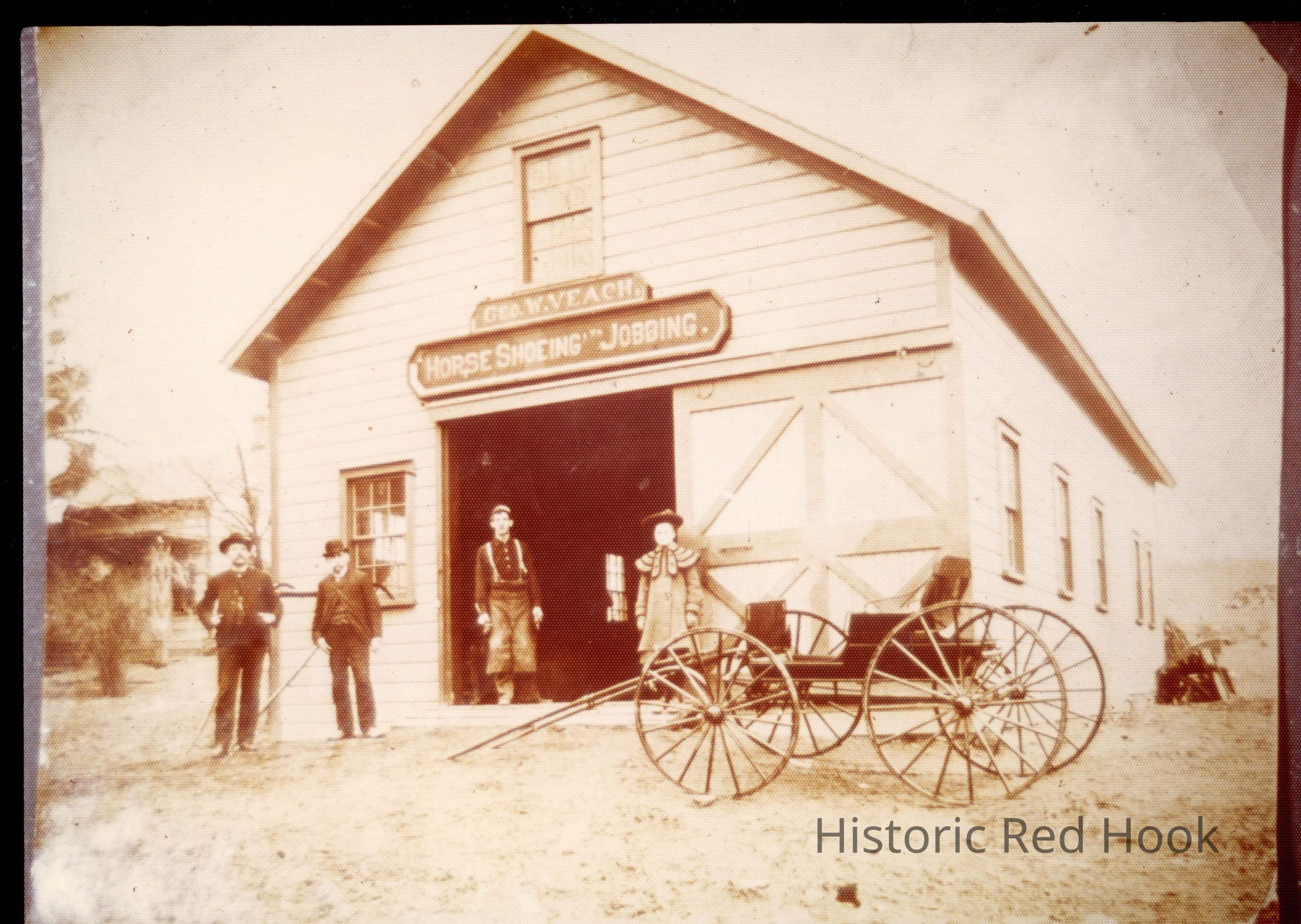 Photo of blacksmith shop 'Geo. W. Veach.' Sign says "Horse Shoeing. Jobbing" Three men and a woman are standing out front along with a horse-drawn buggy.This barn goes with the house at 1077 River Road (2015.008.332)Photograph Details