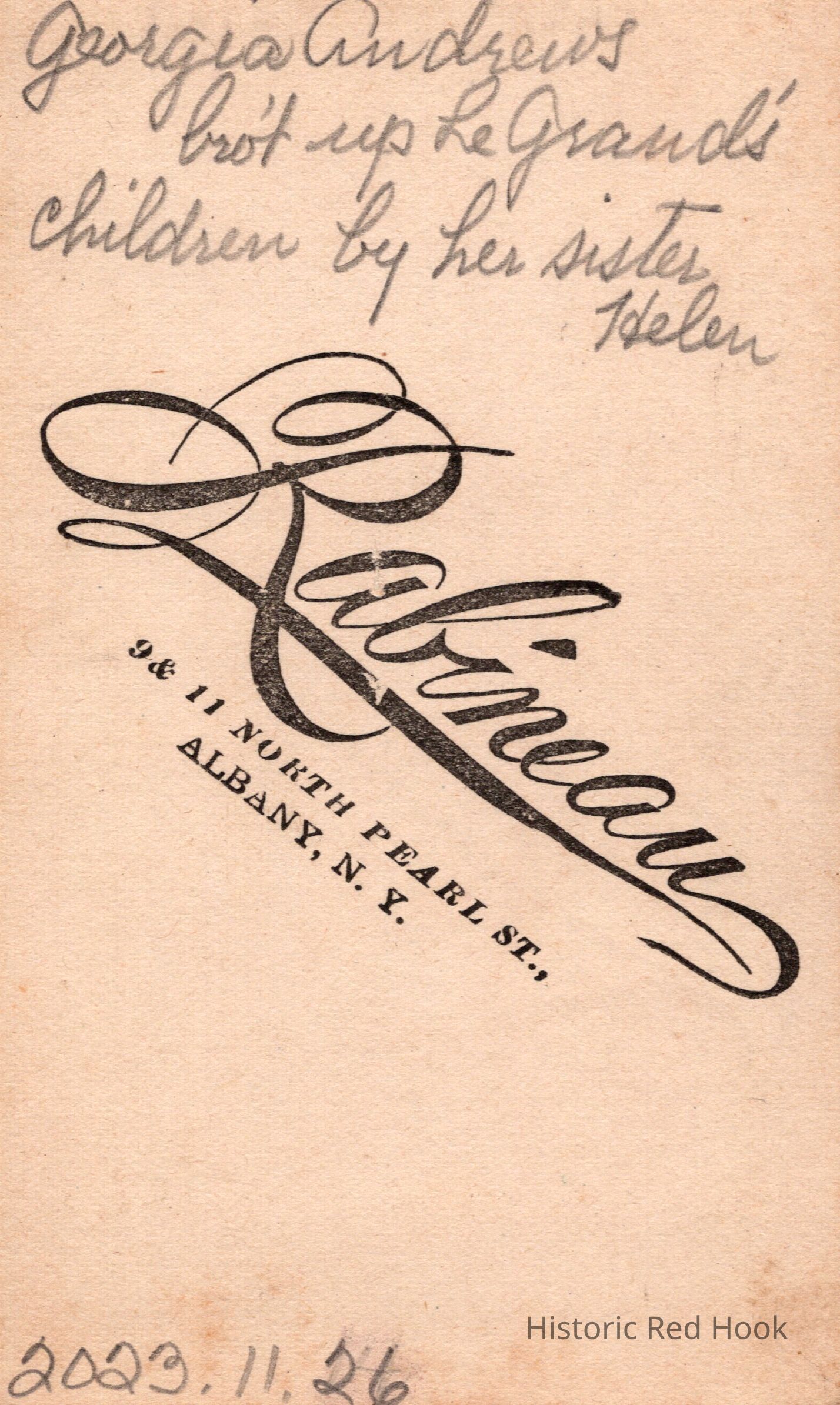 Formal portrait of Georgia Andrews. Written on back "bro't up LeGrand's children by her sister Helen"Photograph Details