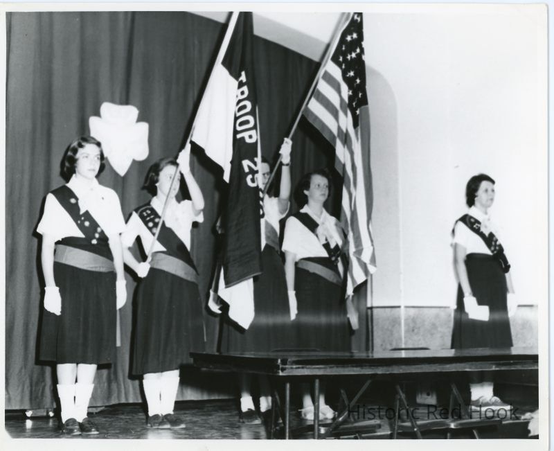 Girl Scouts Troop 25 raising flags on high school stage, 1959.