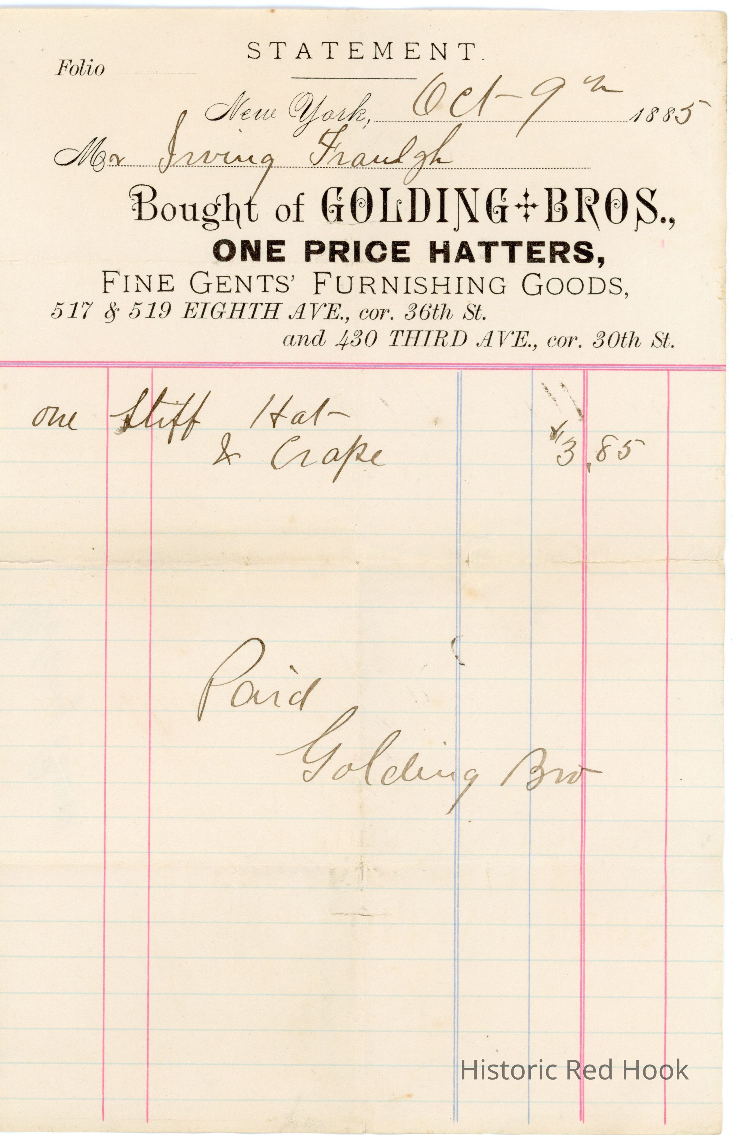 Receipt from Golding Bros., NYC listing a stiff hat and cape dated October 9th, 1885 for Irving Fraleigh.Relationships