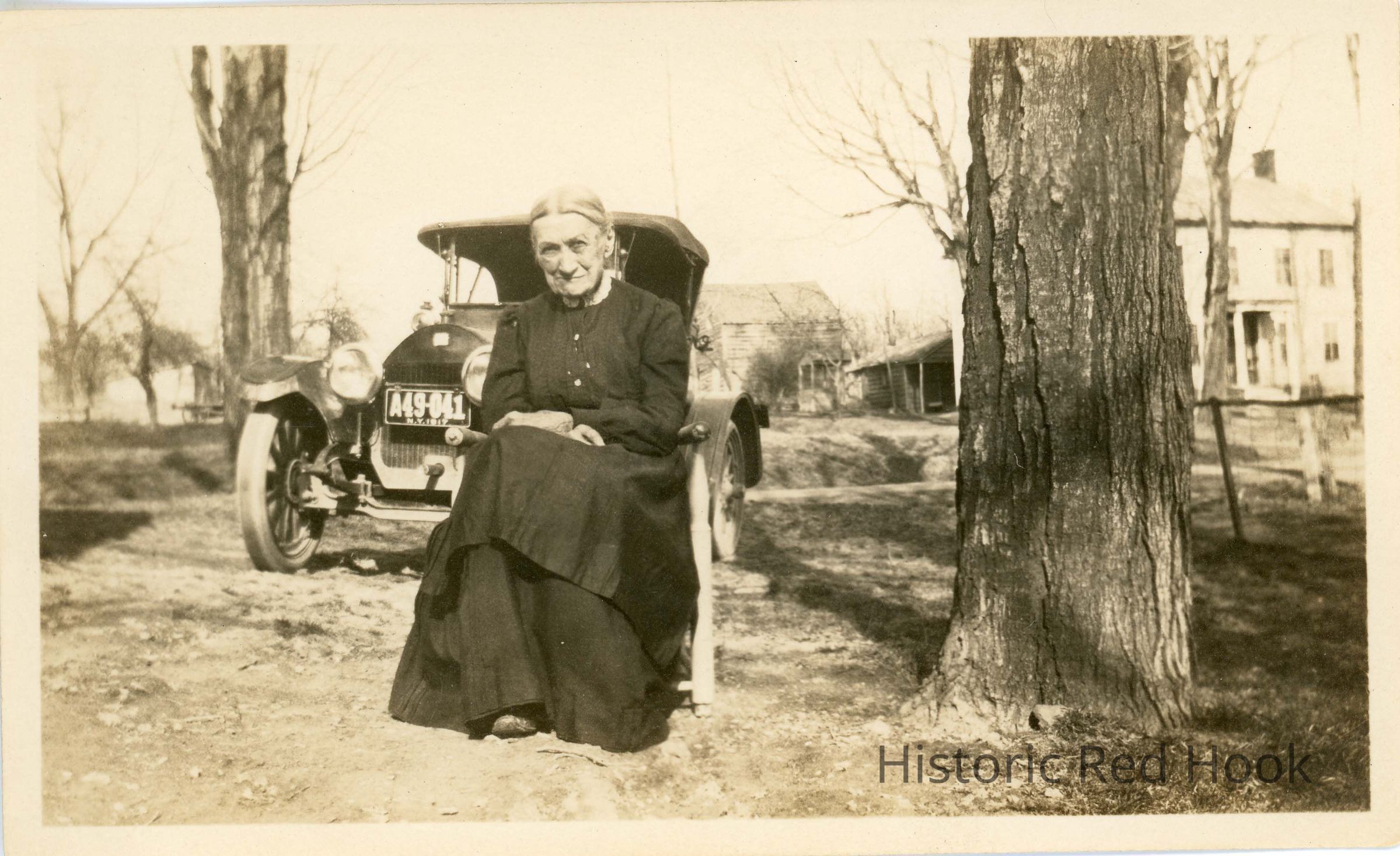 Elderly woman (Grandma Decker) sitting in yard, in front of car. Mother of Delia Decker Norcutt Martin.Collection