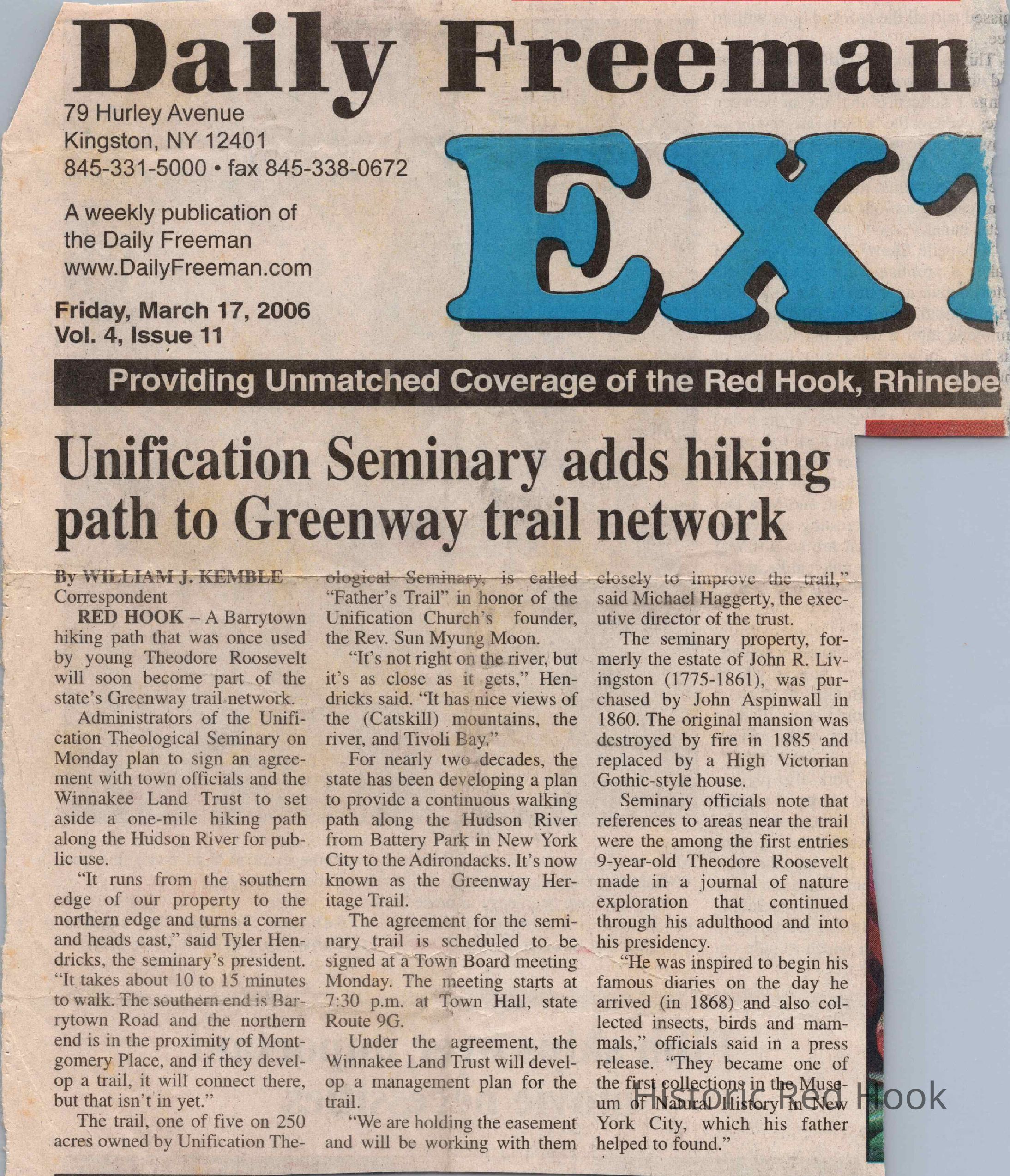 A Daily Freeman article dated March 17, 2006 about the new trail located at the Unification Seminary Property (formerly Massena Estate).Collection