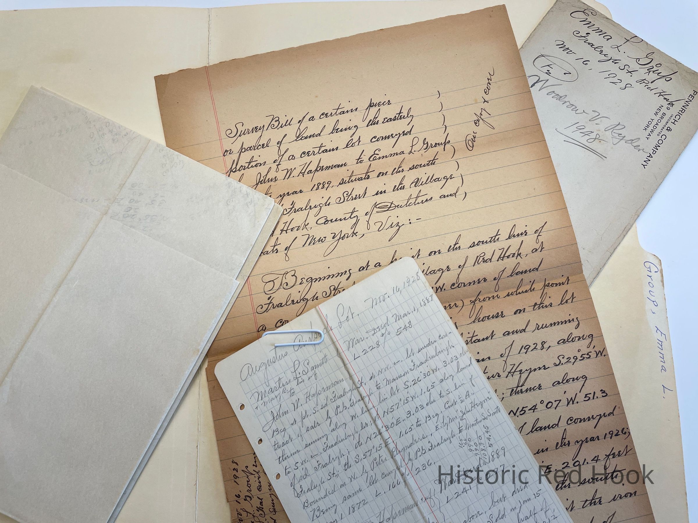 Survey: For Emma L. Group 16 Nov 1928 Lot from John W. Hapeman to Emma L. Group in 1889, south side of Fraleigh St. 0.24 acre
