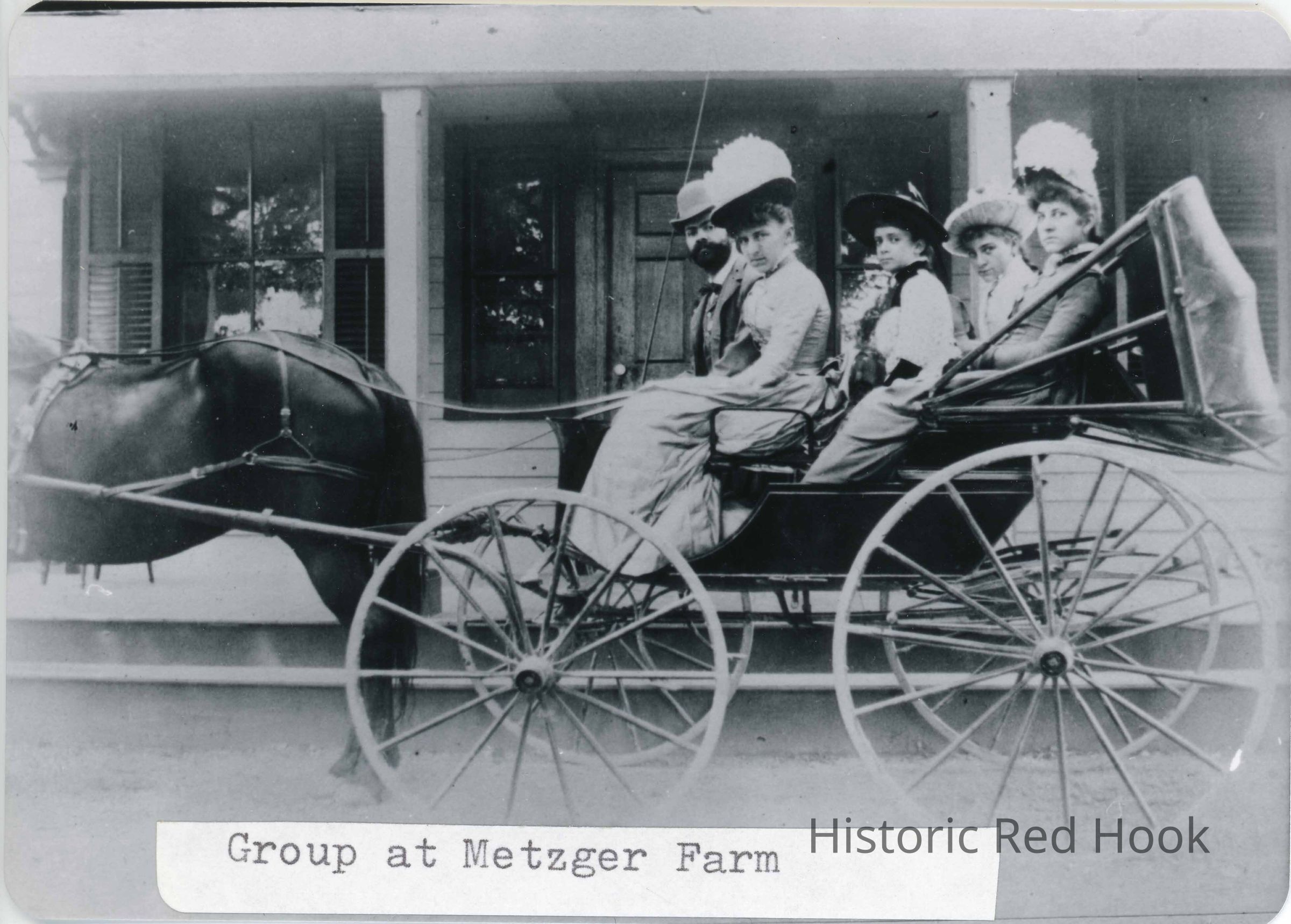 Group photograph of a man and women seated in a horse drawn open carriage at Metzger Farm 1888Photograph Details