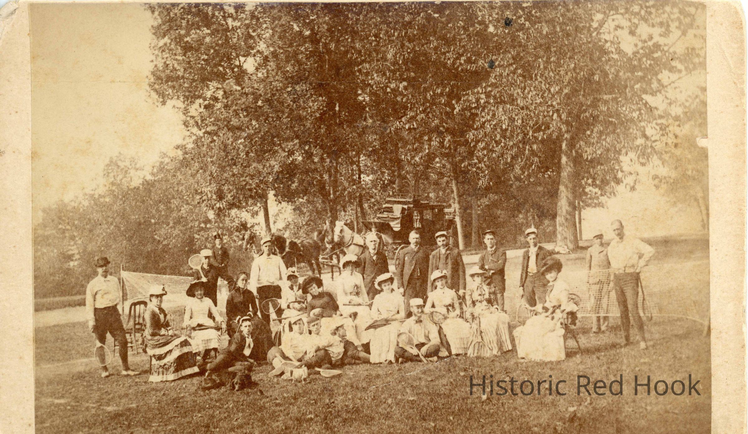 Photo of a group of people sitting and standing in a park-like setting on either side of what appears to be a tennis court net. Some are holding what appear to be tennis rackets and a horse and carriage stands behind them. possibly 1880s?