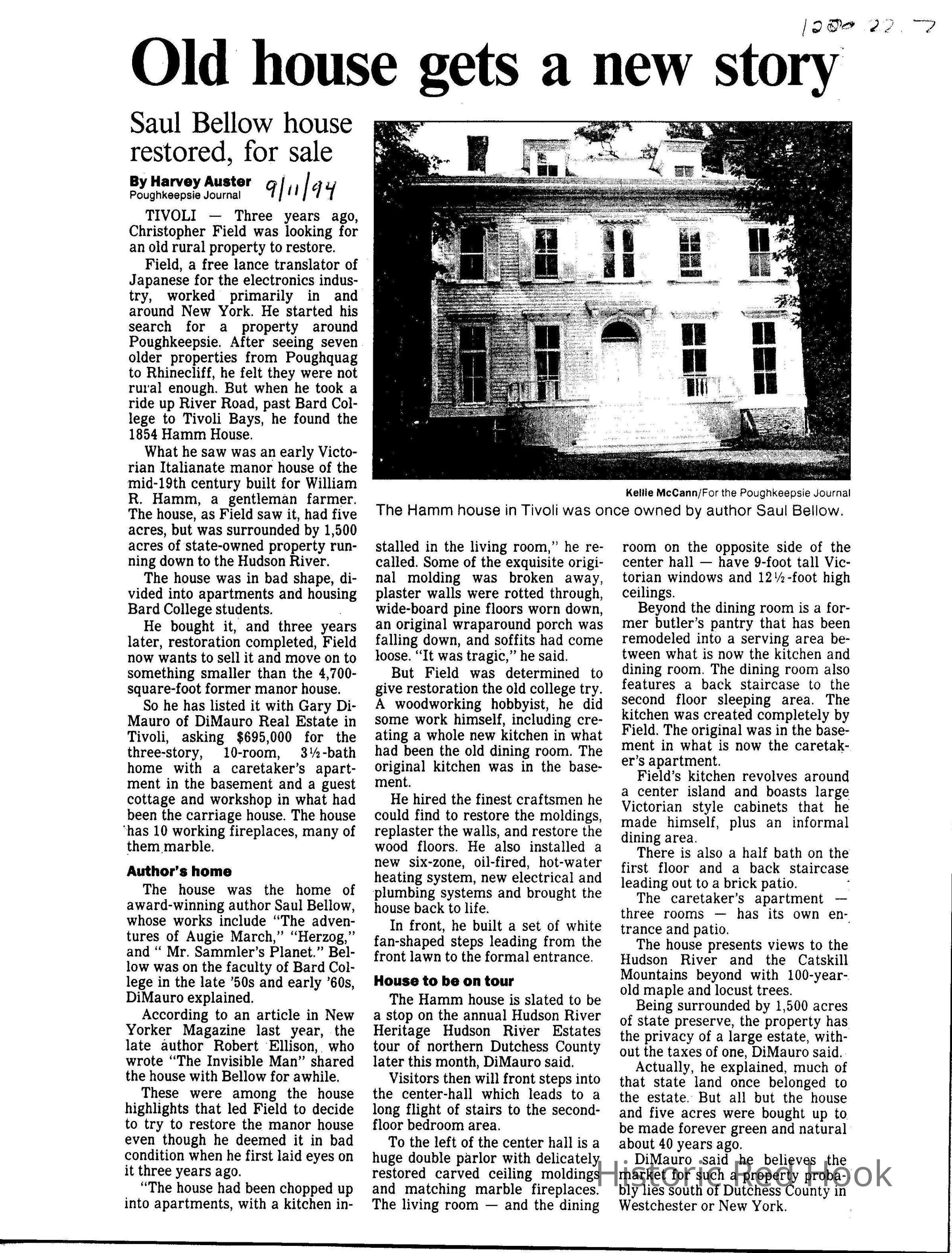 Poughkeepsie Journal article, Sept 11, 1994 about new owner of Ham House (spelled Hamm House in article).Collection
