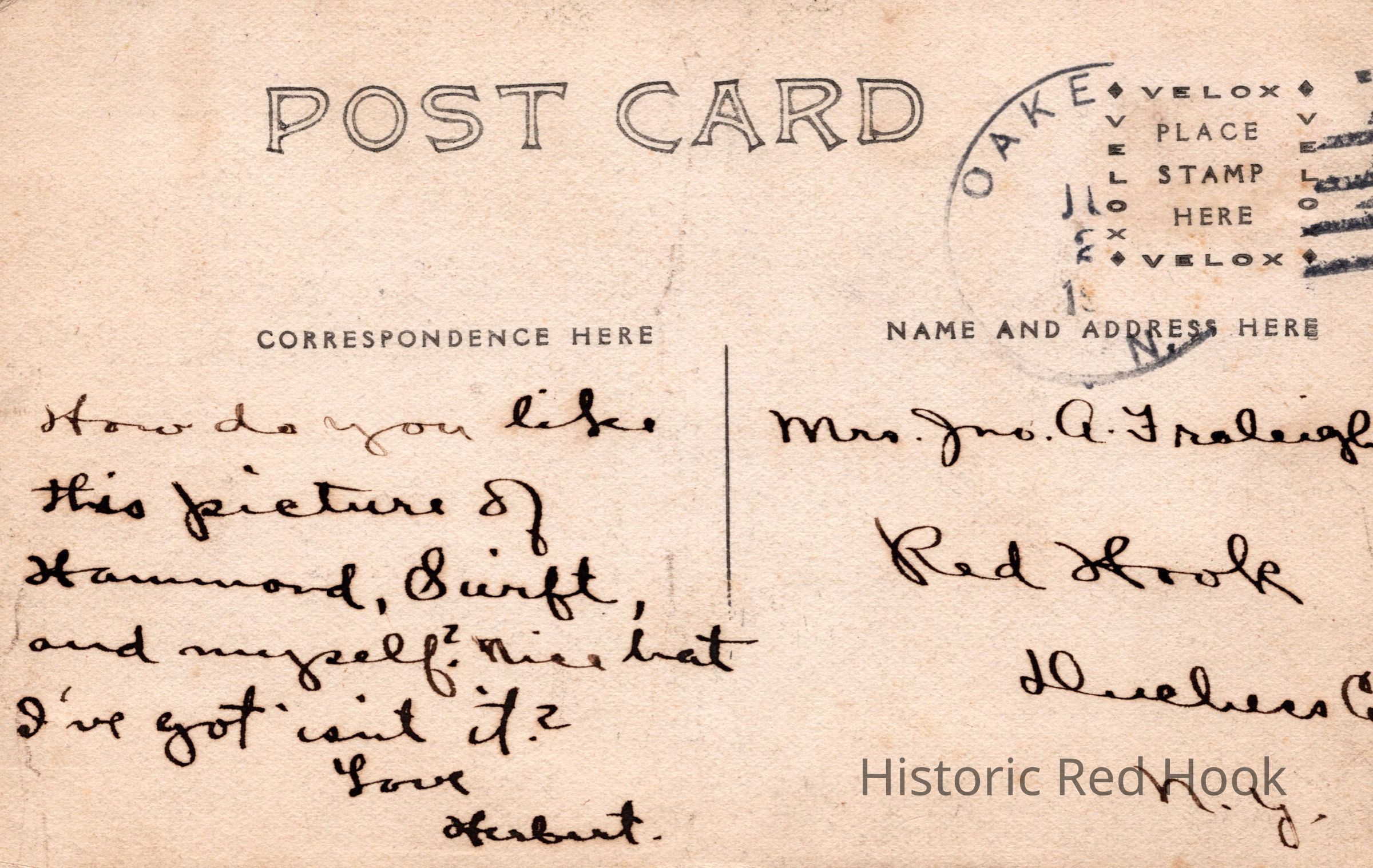 Postcard addressed to Mrs. John A. Fraleigh from Herbert [Fraleigh?]