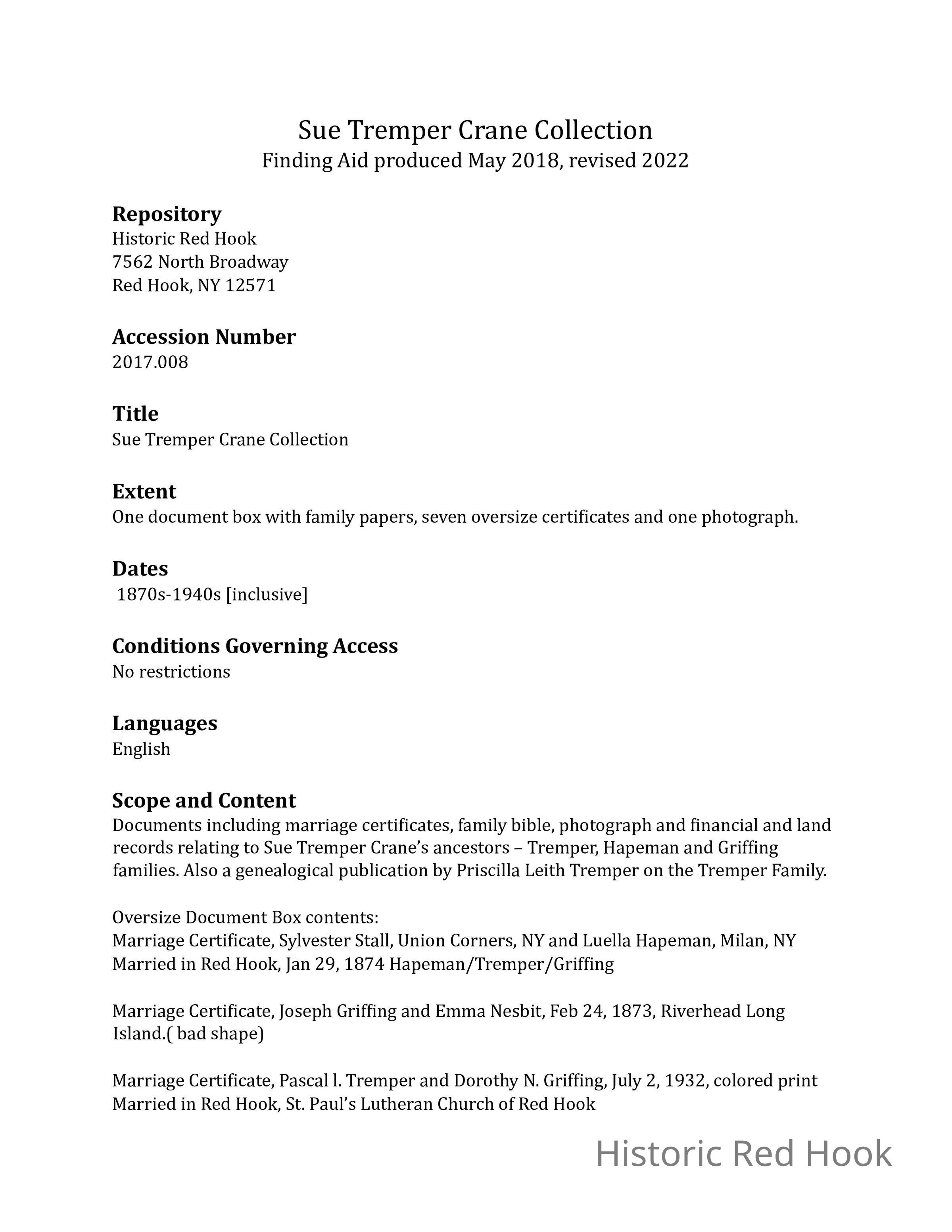 Sue Tremper Crane Collection Finding Aid produced May 2018, revised 2022