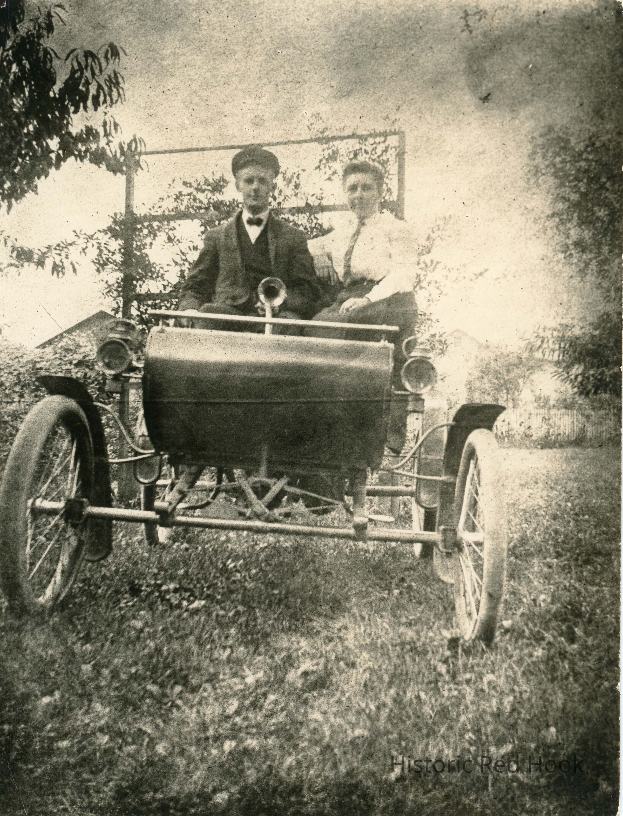 Harvey and Ethel Mead sitting in a new-fangled "horseless" carriage, one of the earliest automobiles in Red Hook. The date 1905 is written on the back.Photograph Details