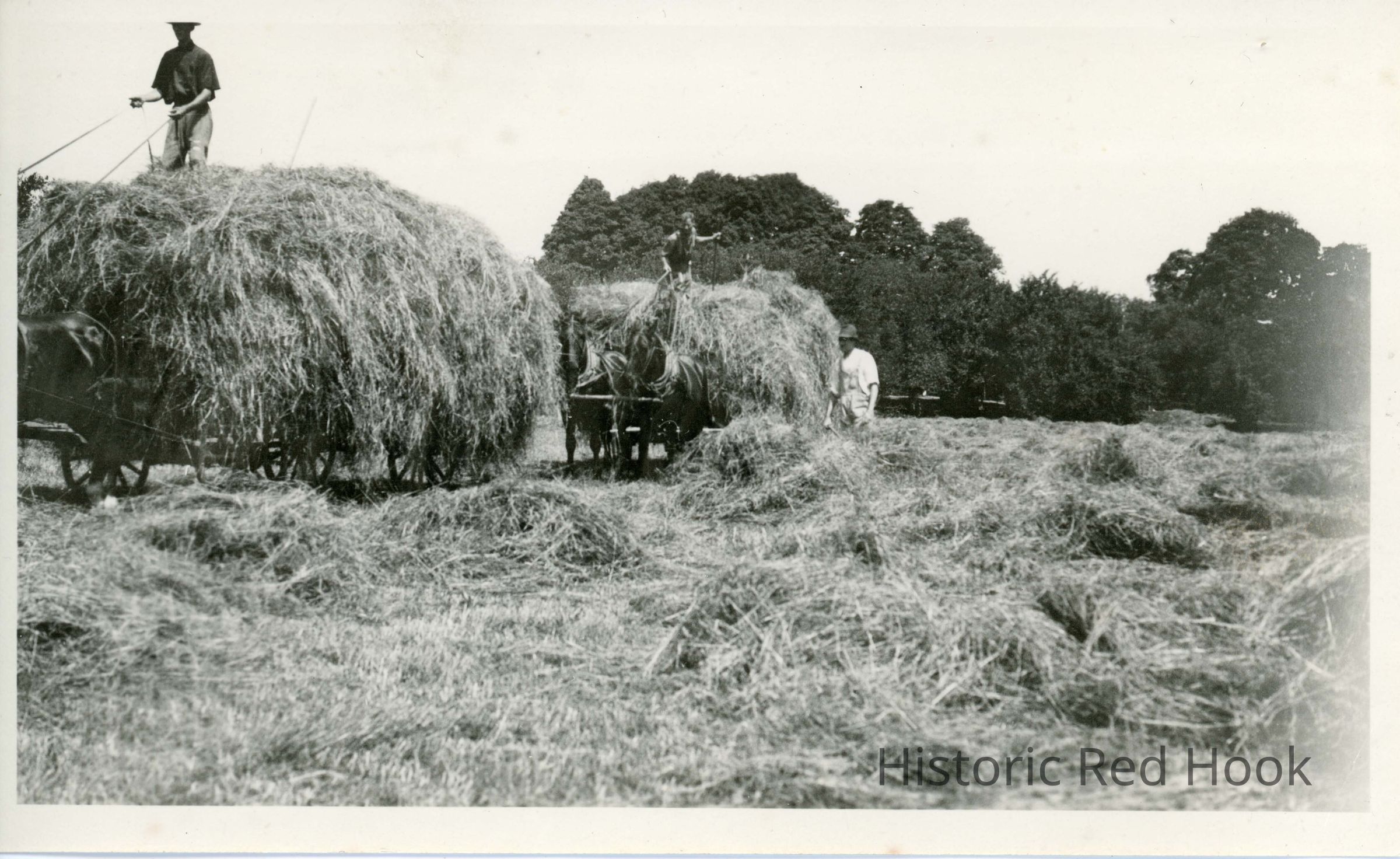 Two horse drawn wagons with men stacking hay by hand. (Glassplate negatives in W.S. Teator collection 2018.006)