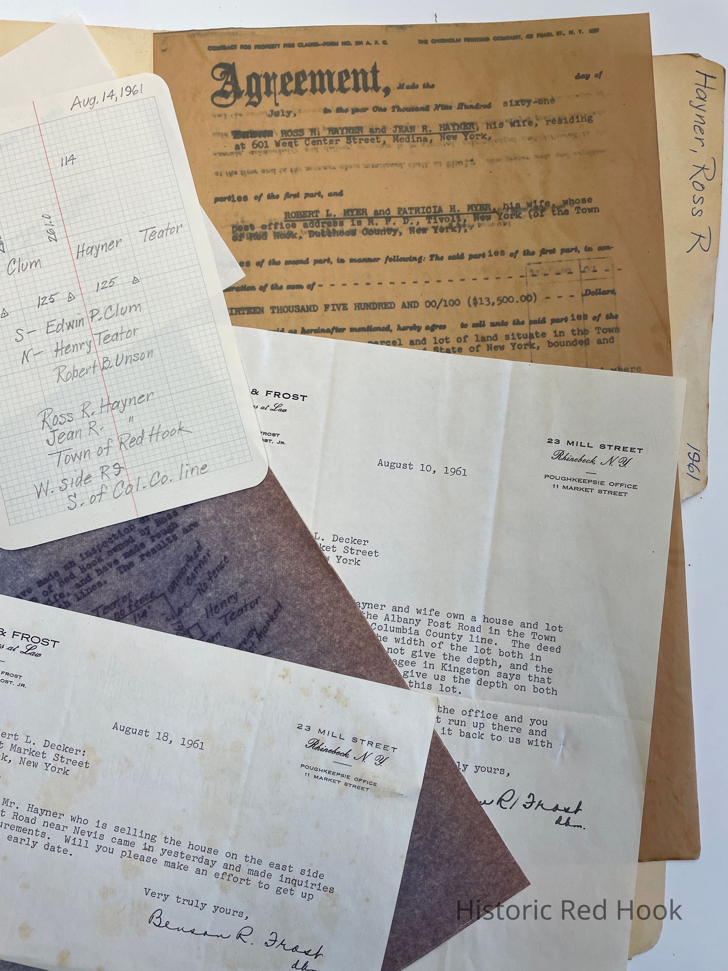 Deed: Jul 1961 Ross R. Hayner & wife Jean R. Of Medina NY To Robert L. Myer & wife Patricia H. Meyer of Tivoli Lot 125 wide in front & 114 wide in back.