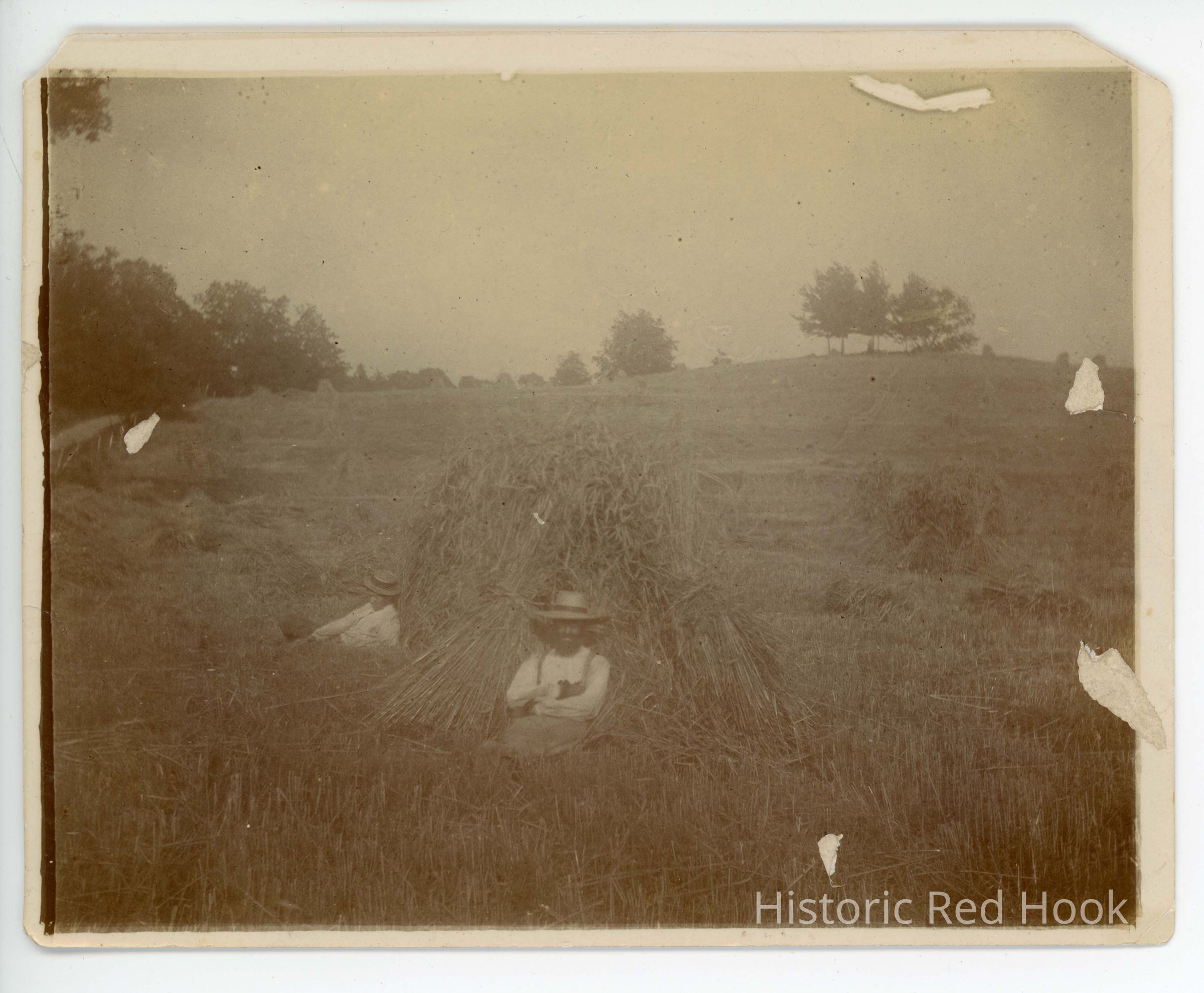 two men sitting near haystacks in middle of field Written on back "1901"