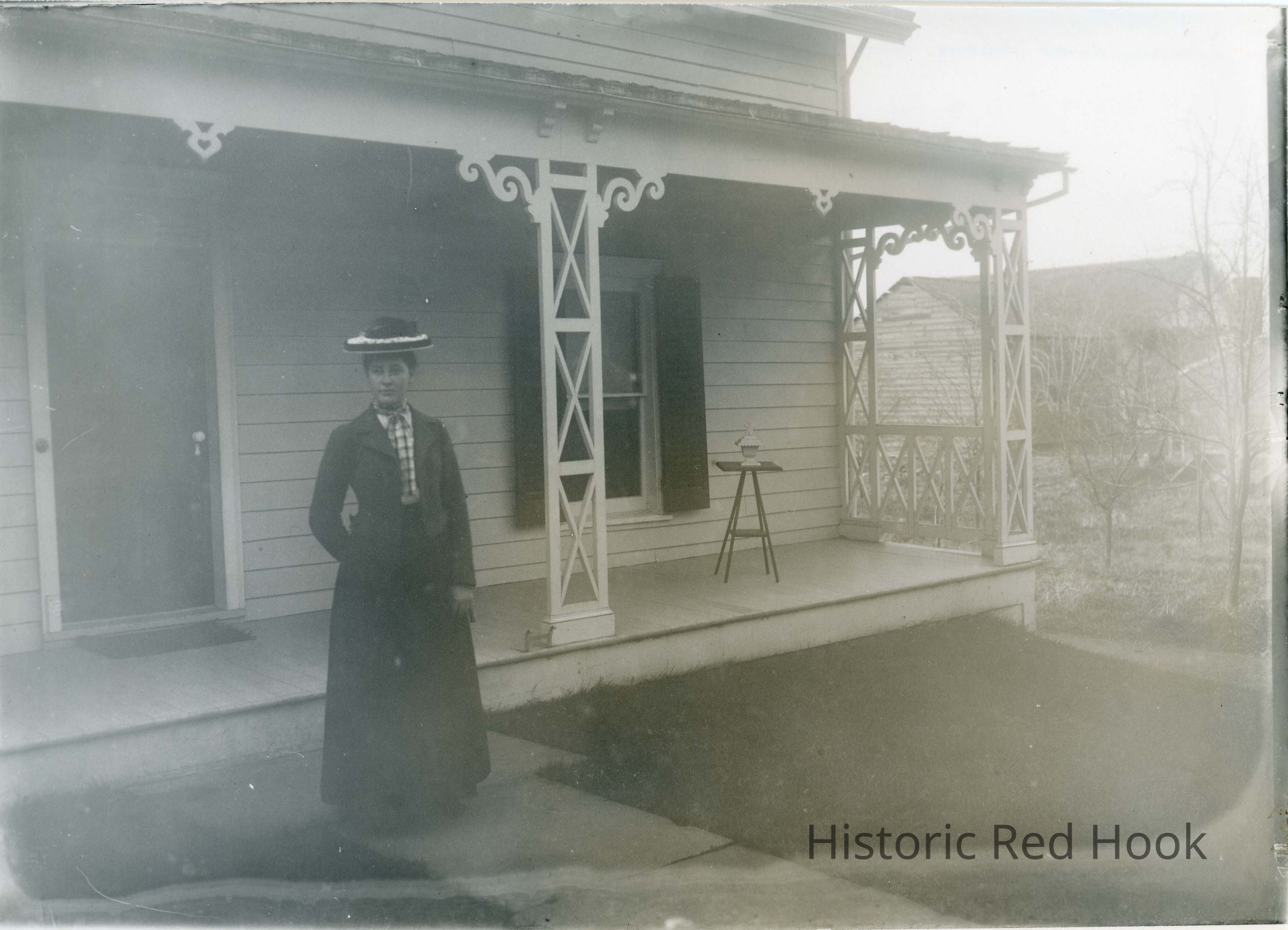 View of a woman standing in front of decorative bracketed front porch. Handwritten on back 'Heermance House' - Jane Heermance? Heermance appears on 1867 map, west side of Upper Red Hook triangle.Photograph Details
