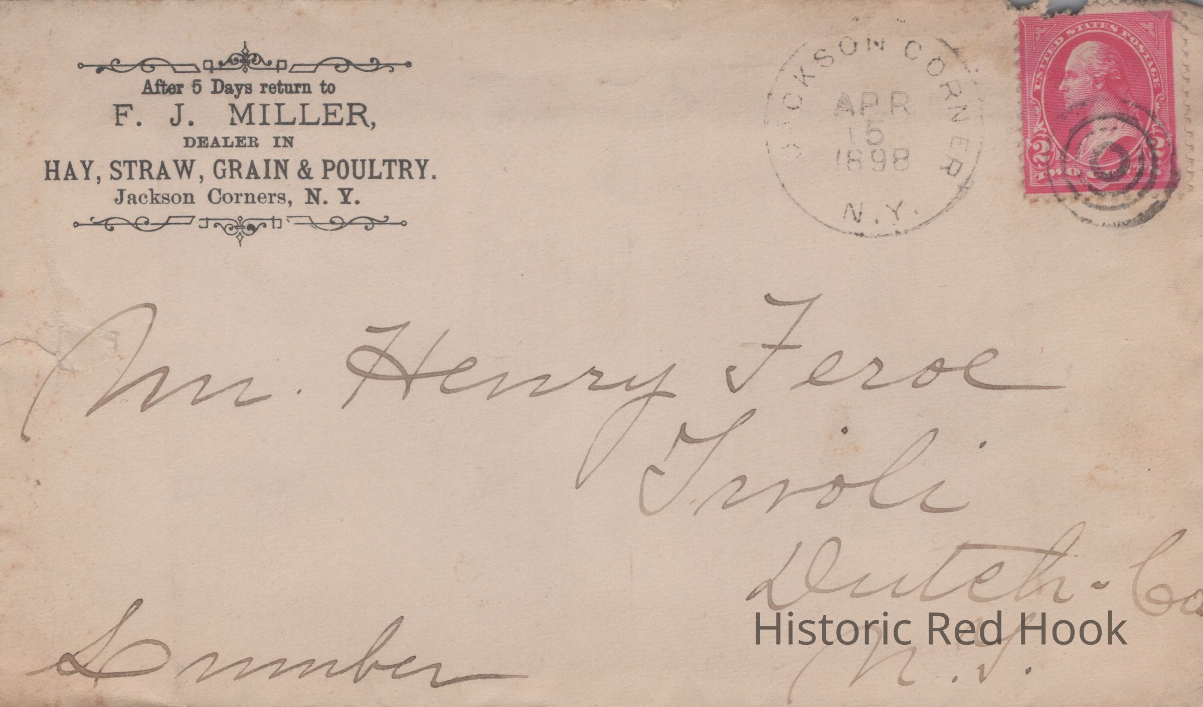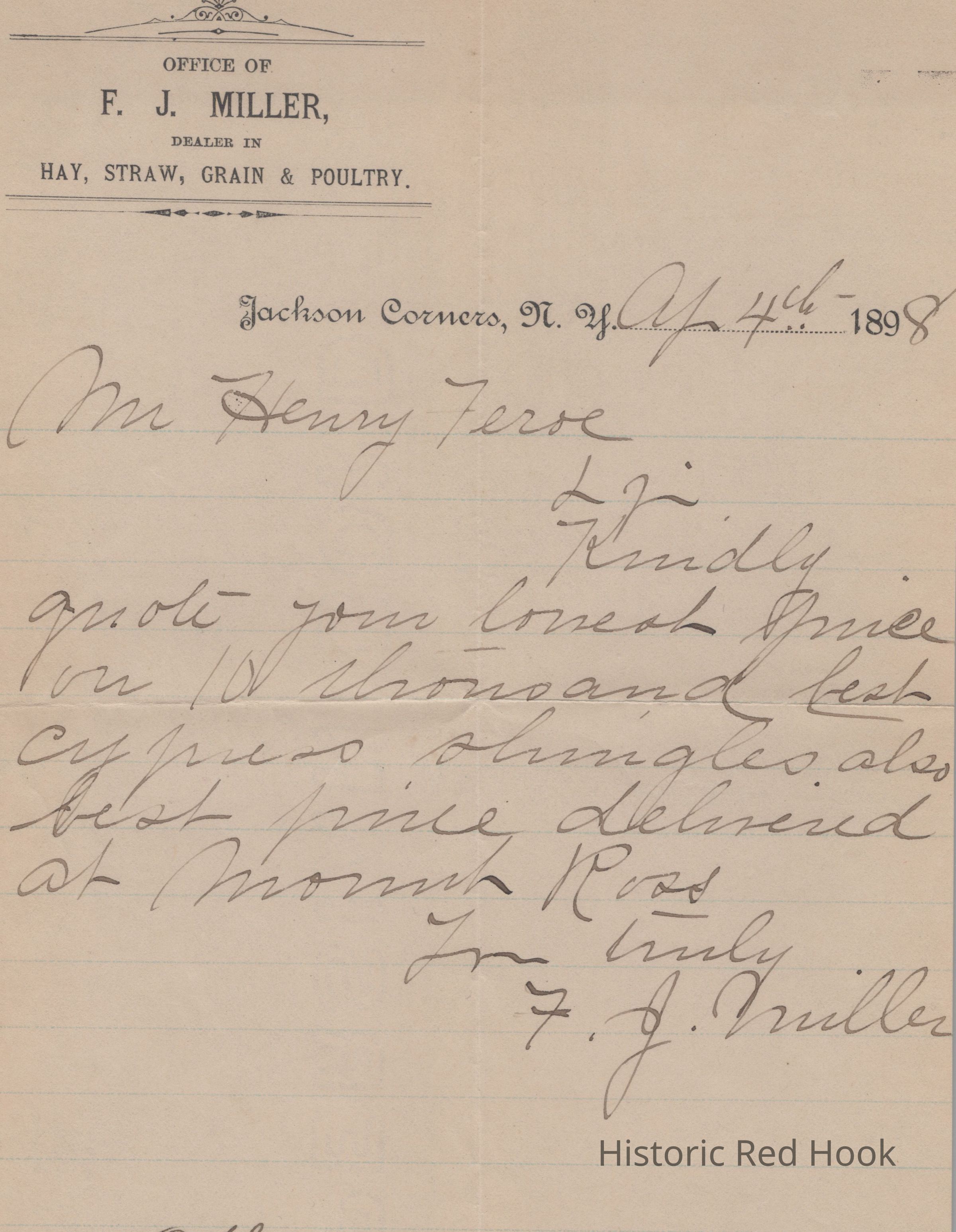 A letter addressed to Mr. Henry Feroe for the lowest price on 10,000 Cypress shingles sent by F. J. Miller, Jackson Corners, New York, dated April, 1898.Collection
