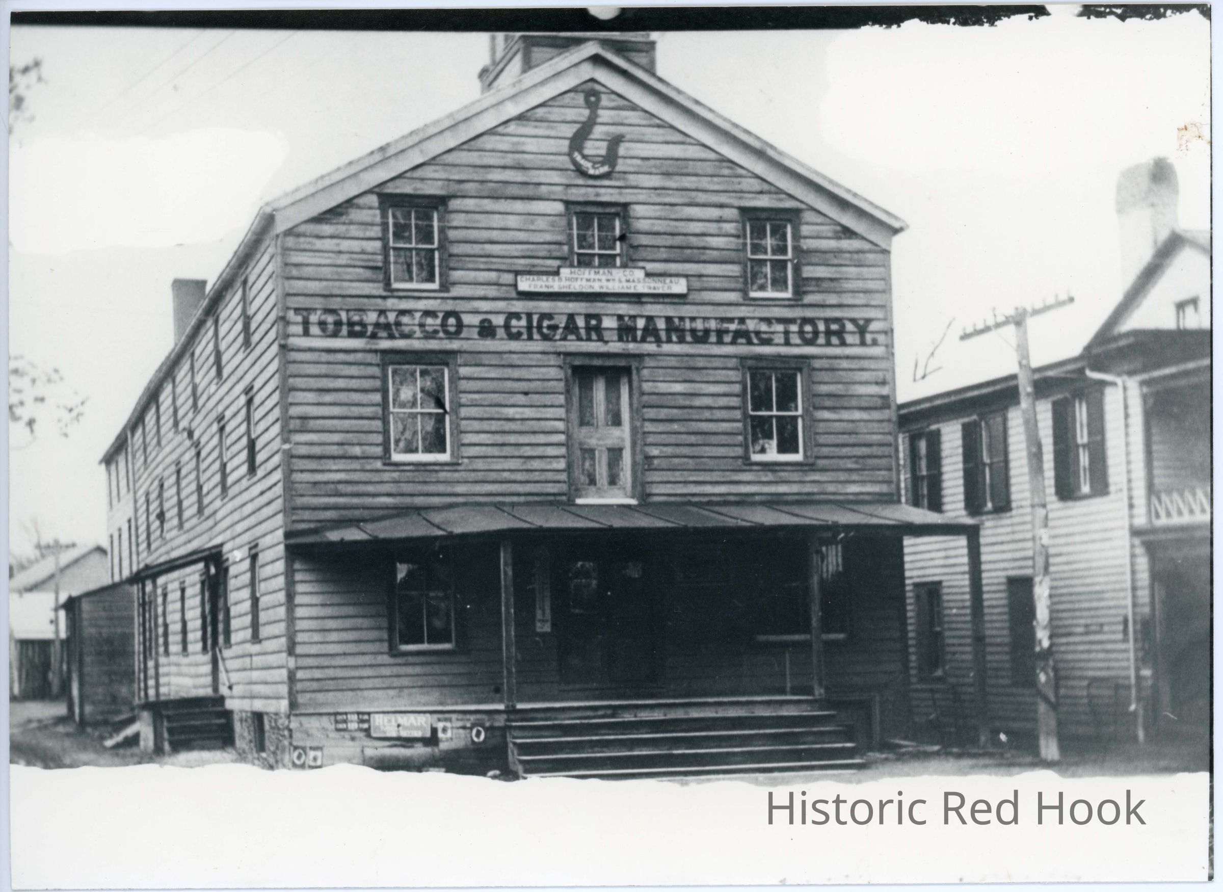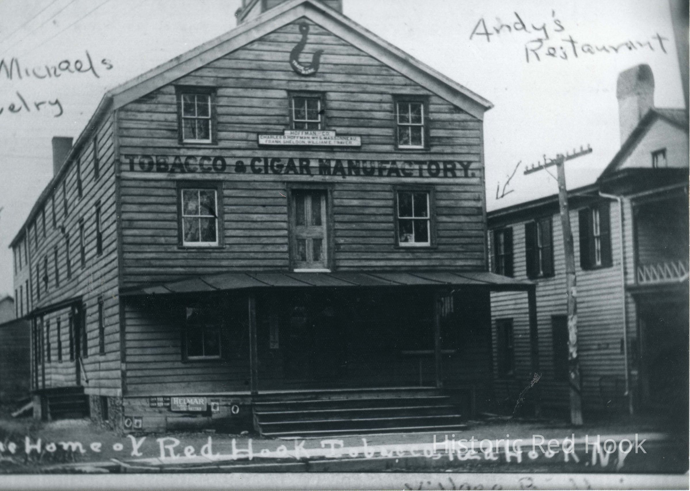 Building belonging to Hoffman & Company, Tobacco & Cigar Manufactory; Charles Hoffman, Wm. B. Massoneau, Frank Sheldon, William E. Traver; also, in the 1950s, home to Andy's Restaurant, favorite teenager hangout after basketball games, and (Joseph) McMichael's Jewelry (as of this 2016 notation, the store's clock hangs in the Village Building courtroom). Two identical photos but one is marked with 1950s businesses.Photograph Details