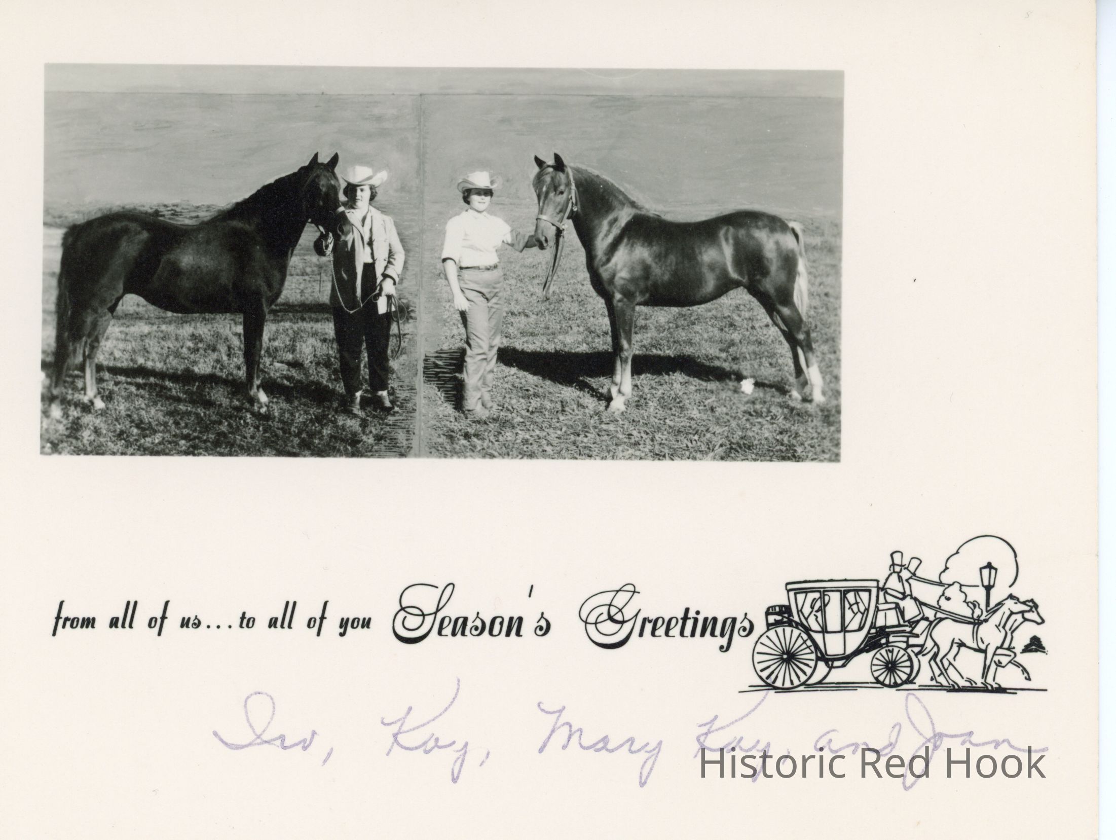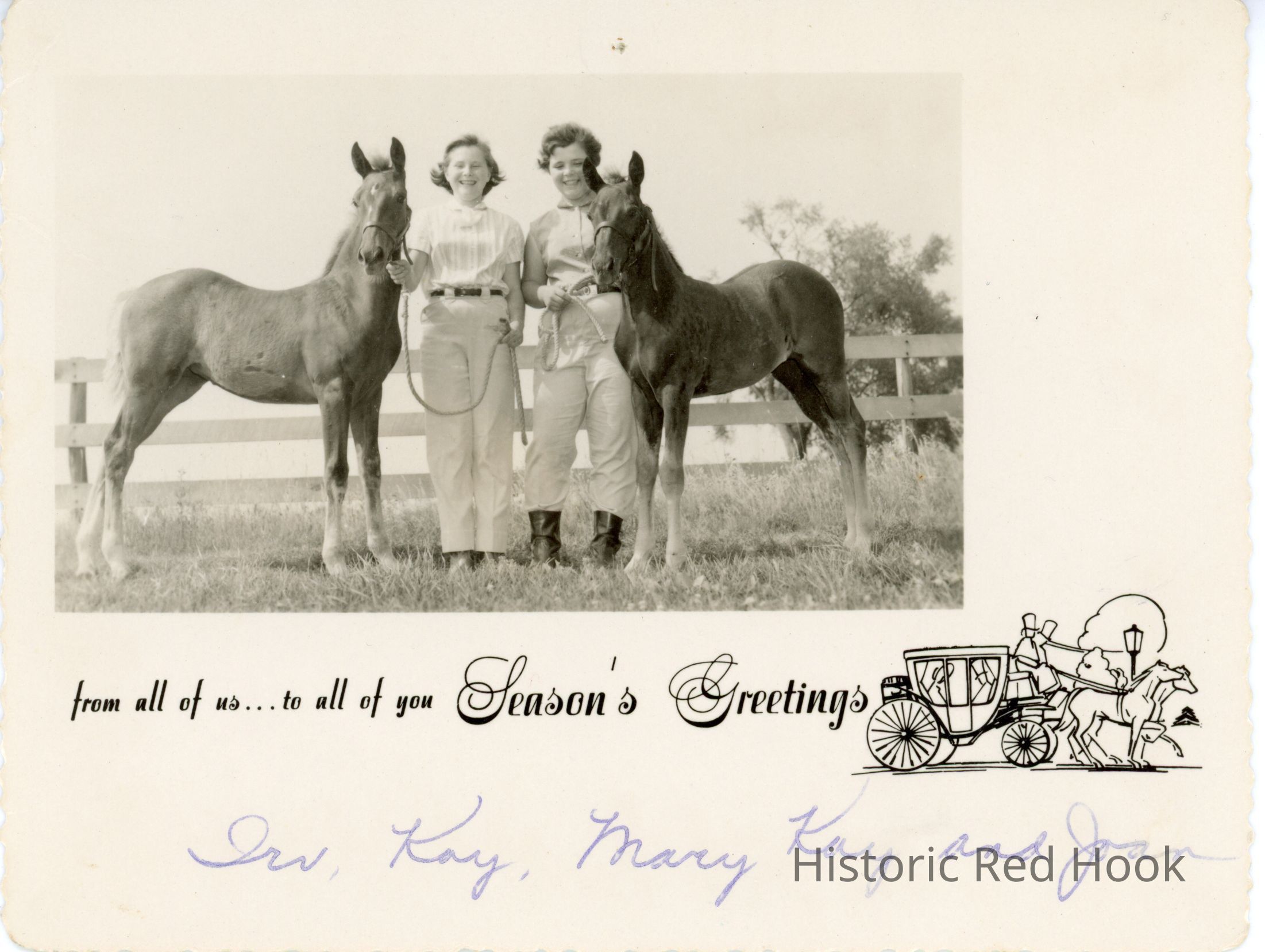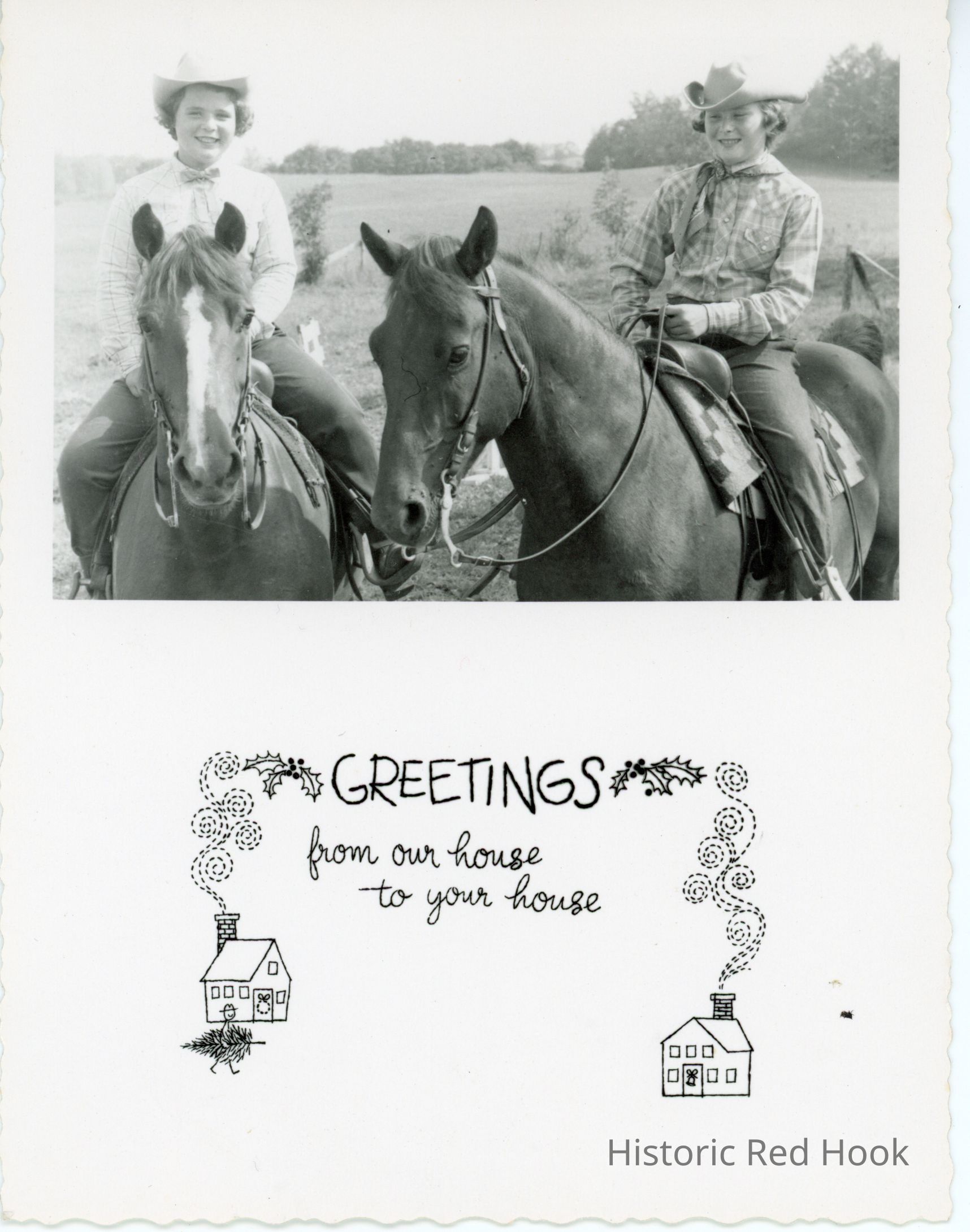 Three holiday greeting postcard from the Irving A. Fraleigh family, with photos of daughters Mary Kay and Joan with their horses.