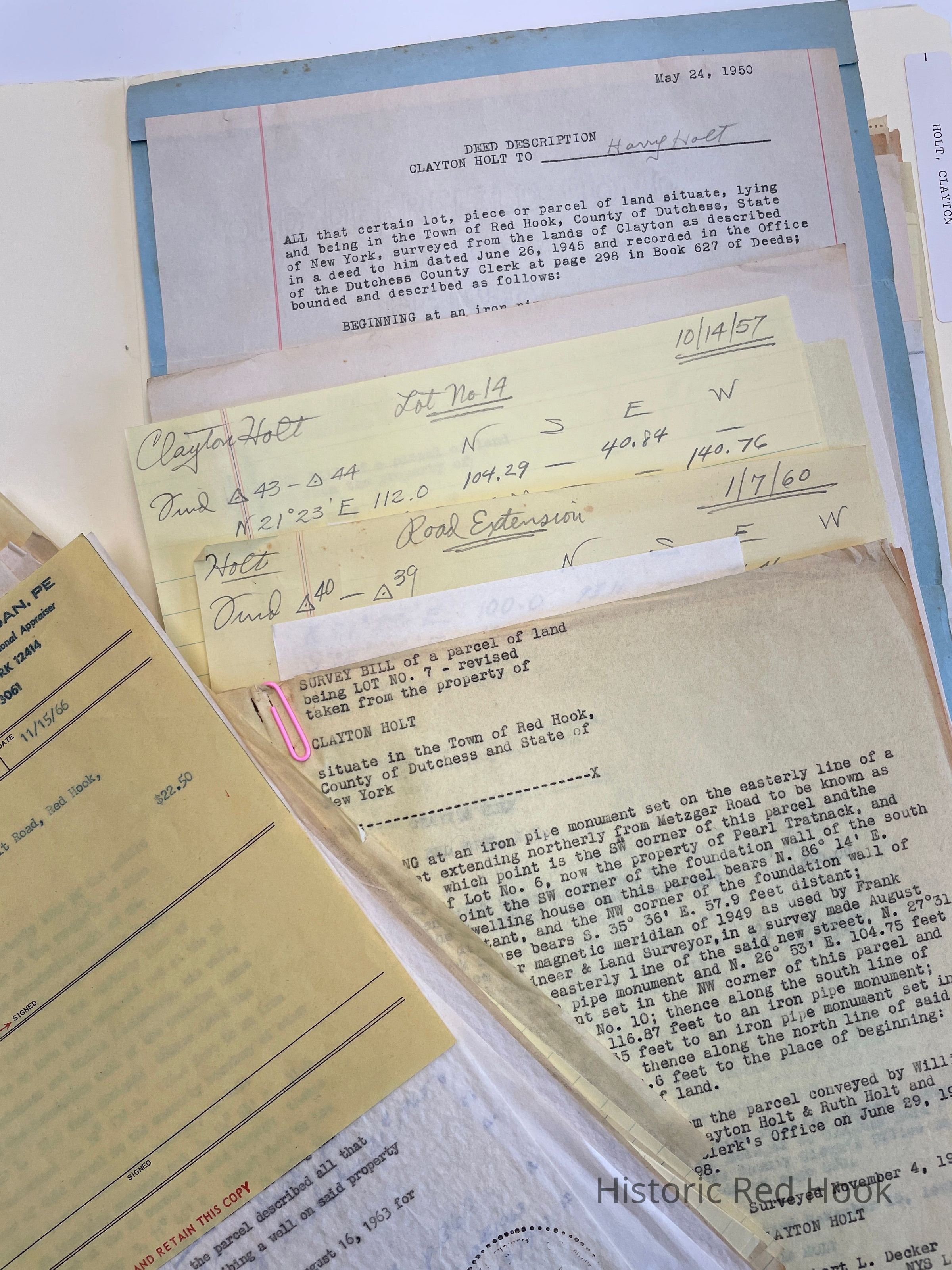 Surveys & Maps: 22 Aug 1949 For Clayton Holt. “The House Lot” 0.496 acre. “The West Lot” 1.72 acres.