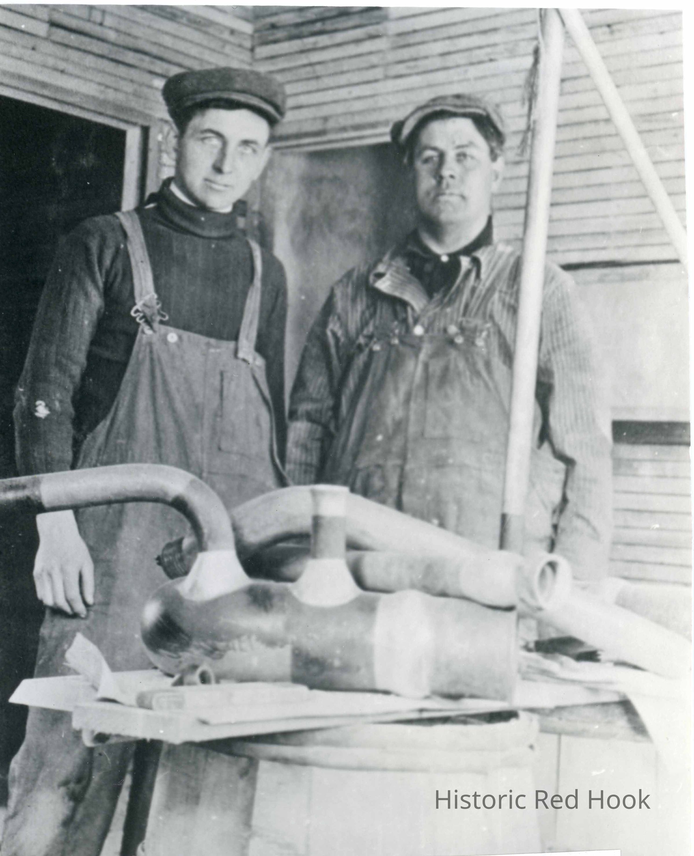Two workmen in front of plumbing parts on a wooden barrel. Label on back of photo says Albert J. Thomas & Raymond (Hooker) Shafer working on a plumbing project. A.J.'s wife, Maude, taught piano lessons in their home on corner of Church St.Photograph Details