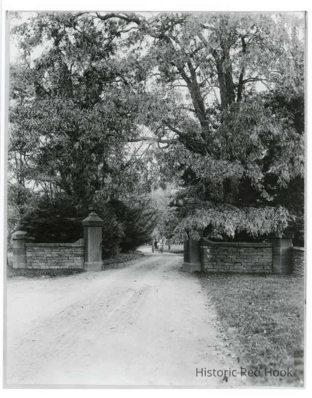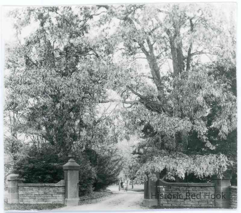 Entrance to river estate (Massena?) with horse and buggy approaching in driveway.
