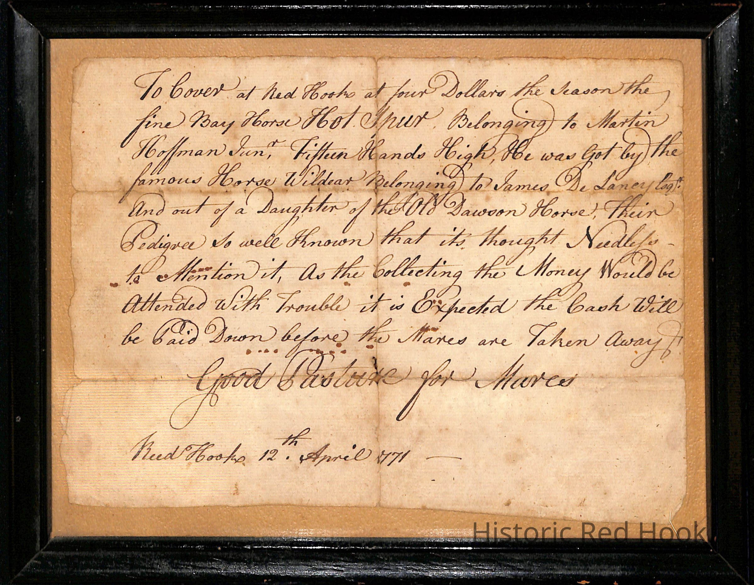 Horse Breeding Ad - Original framed document advertising horse breeding opportunity in Red Hook, dated 1771.