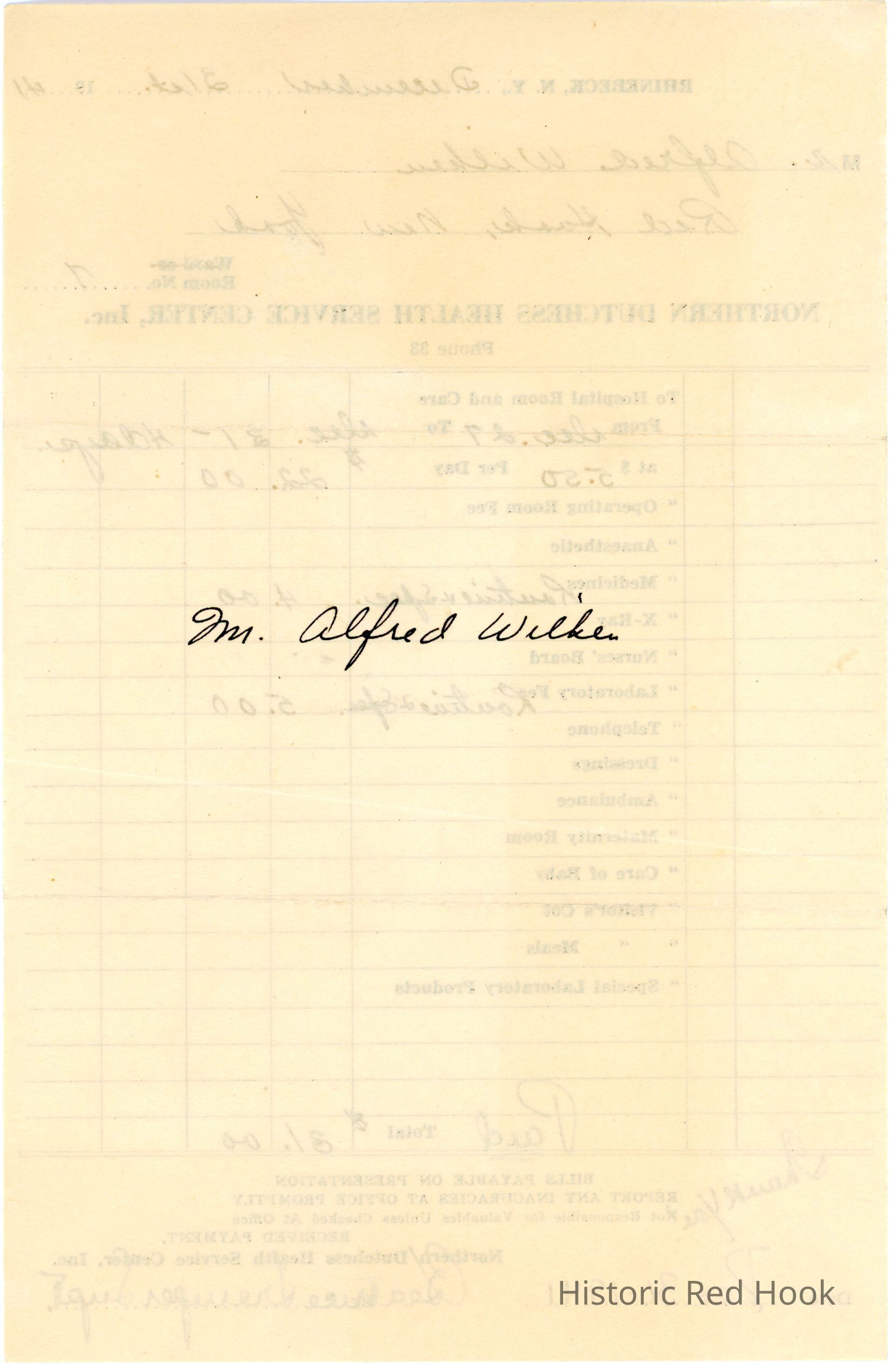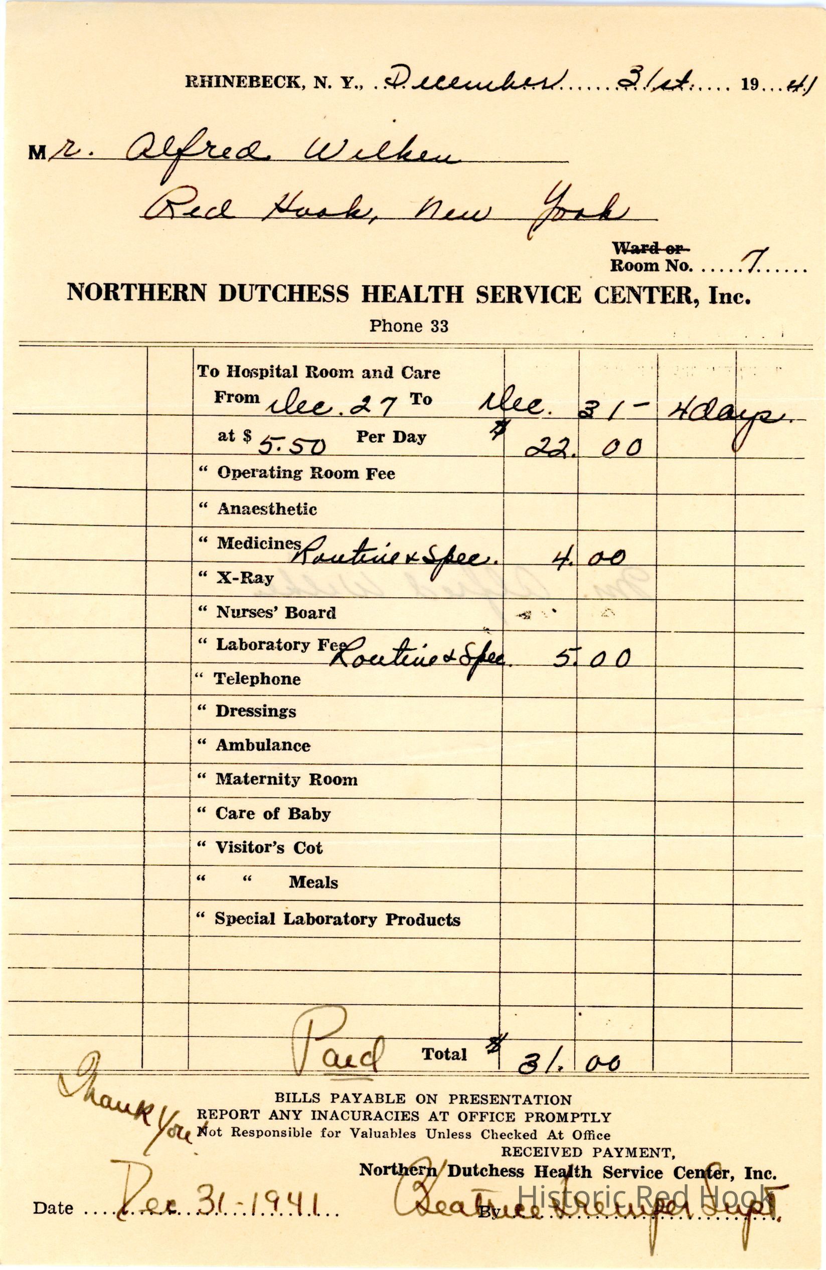 Alfred Wilken's receipt for hospital and medications, Dec 27-Dec 31, Northern Dutchess Health Service Center, Dec 31, 1941.Collection