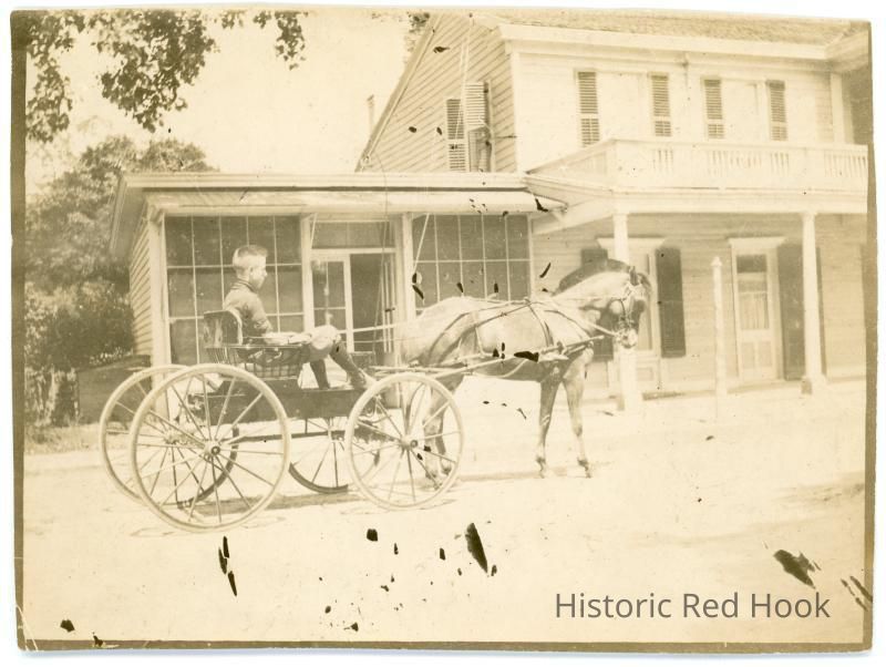 Howard Sheldon driving a horse-drawn buggy in front of a house. Howard and Ruth Sheldon owned Peter's Inn (now the Elks Club). This image was from his daughter, Kay Dillman.Photograph Details