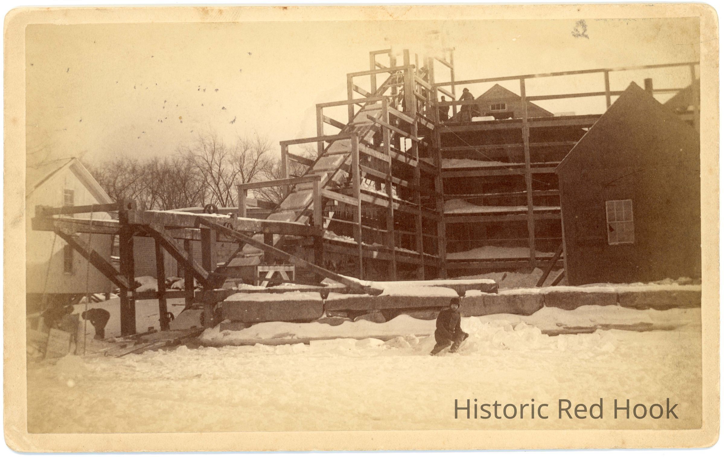 Ice House, Barrytown 1890. Shows men in and on top of ice house with ramp raising ice blocks into the ice house.