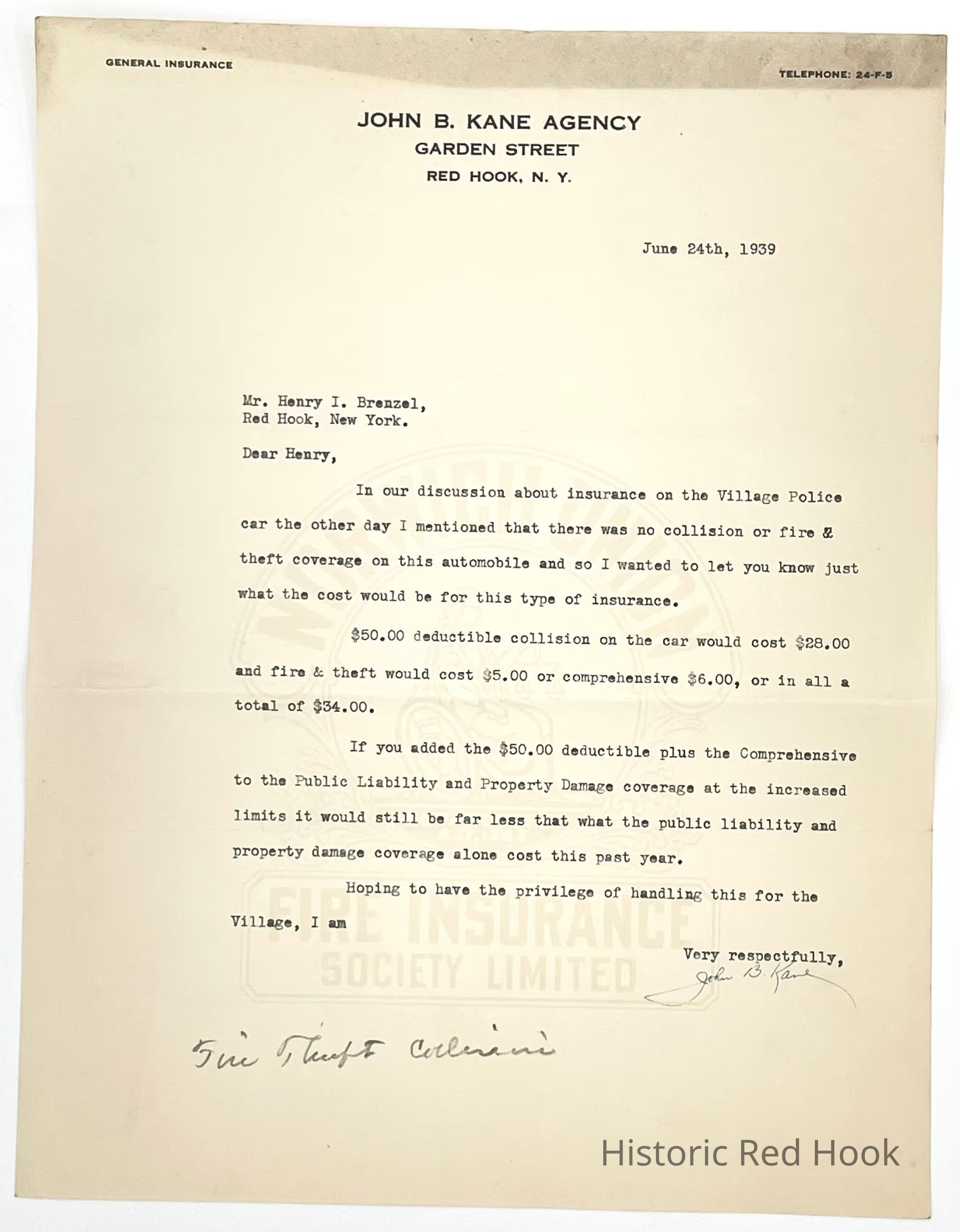 Quote for insurance on the Village Police car from the John B. Kane Agency. 1939Relationships