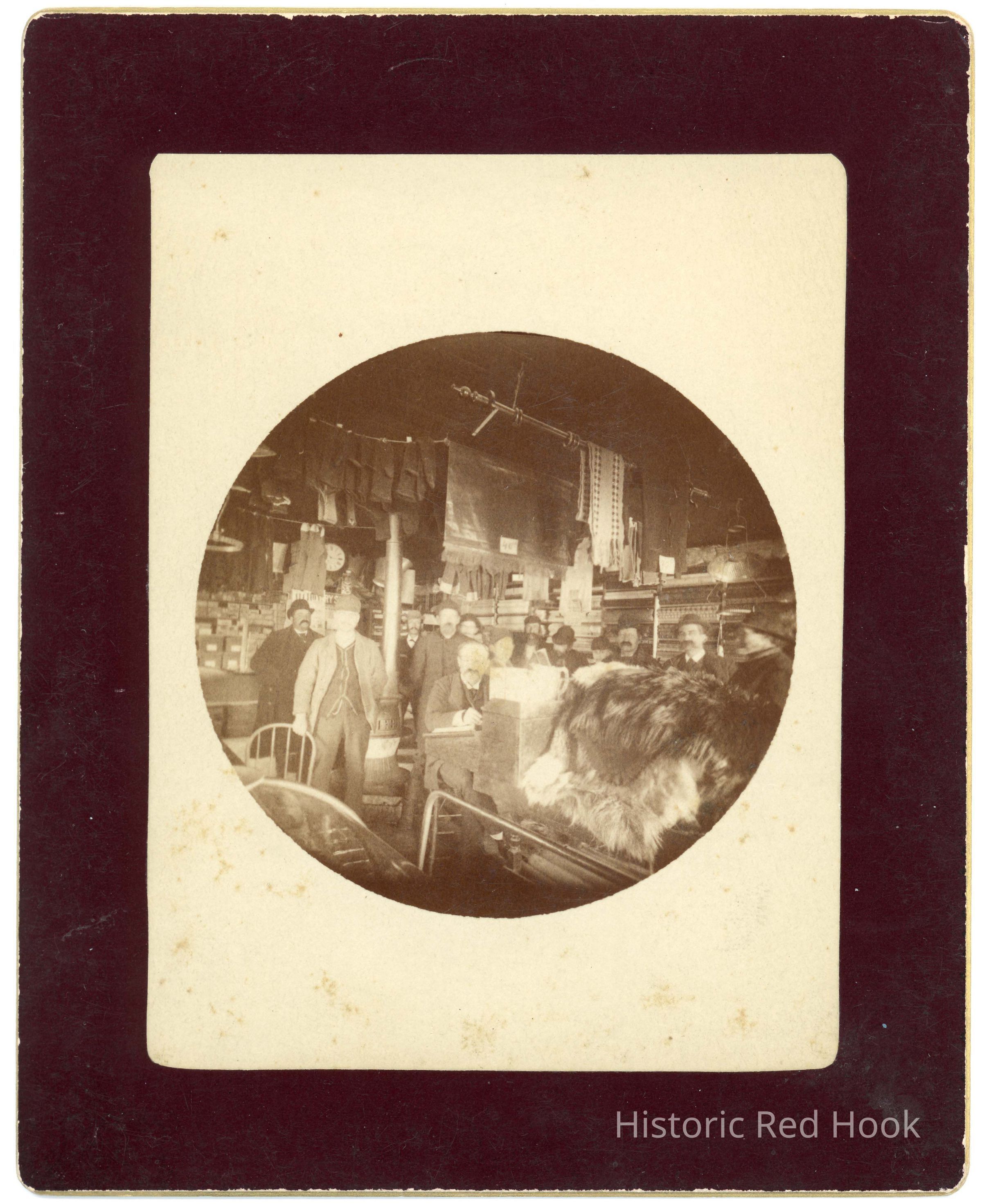 Photo mounted on cardboard, men standing inside Perine's Store, Upper Red Hook. Printed on back: "Manufacturers of the Kodak Camera, the Eastman Co., Rochester, N.Y."Photograph Details