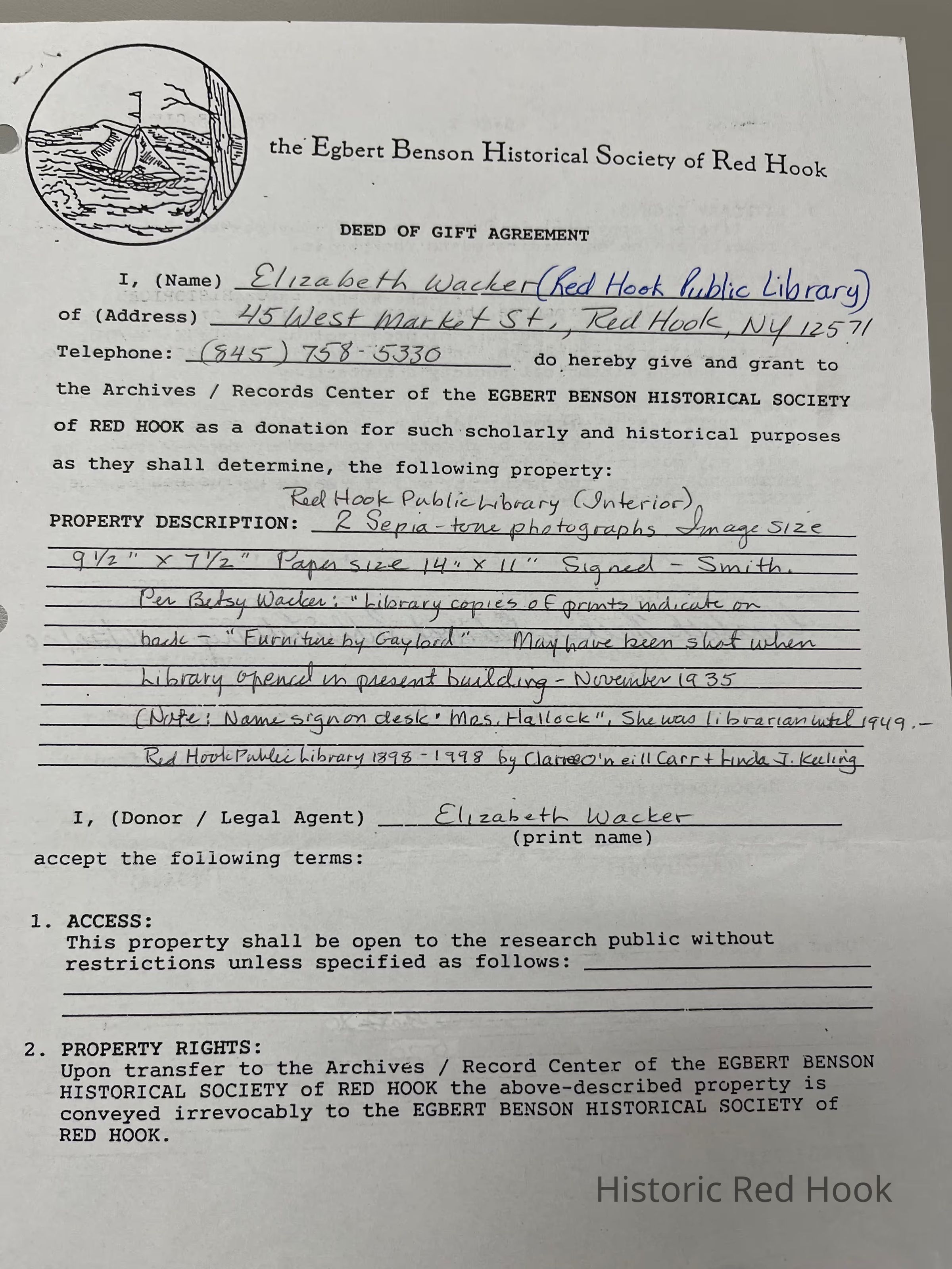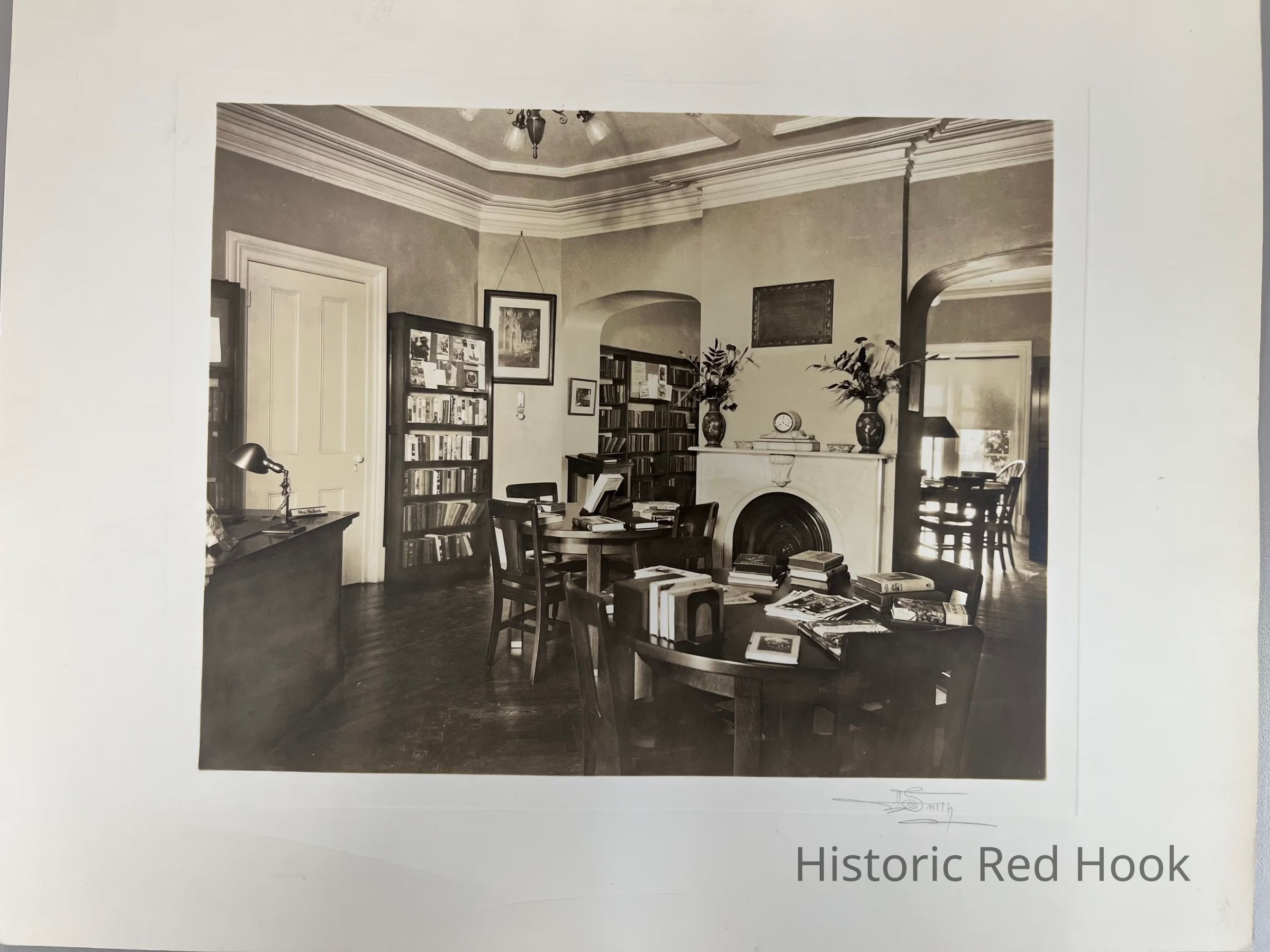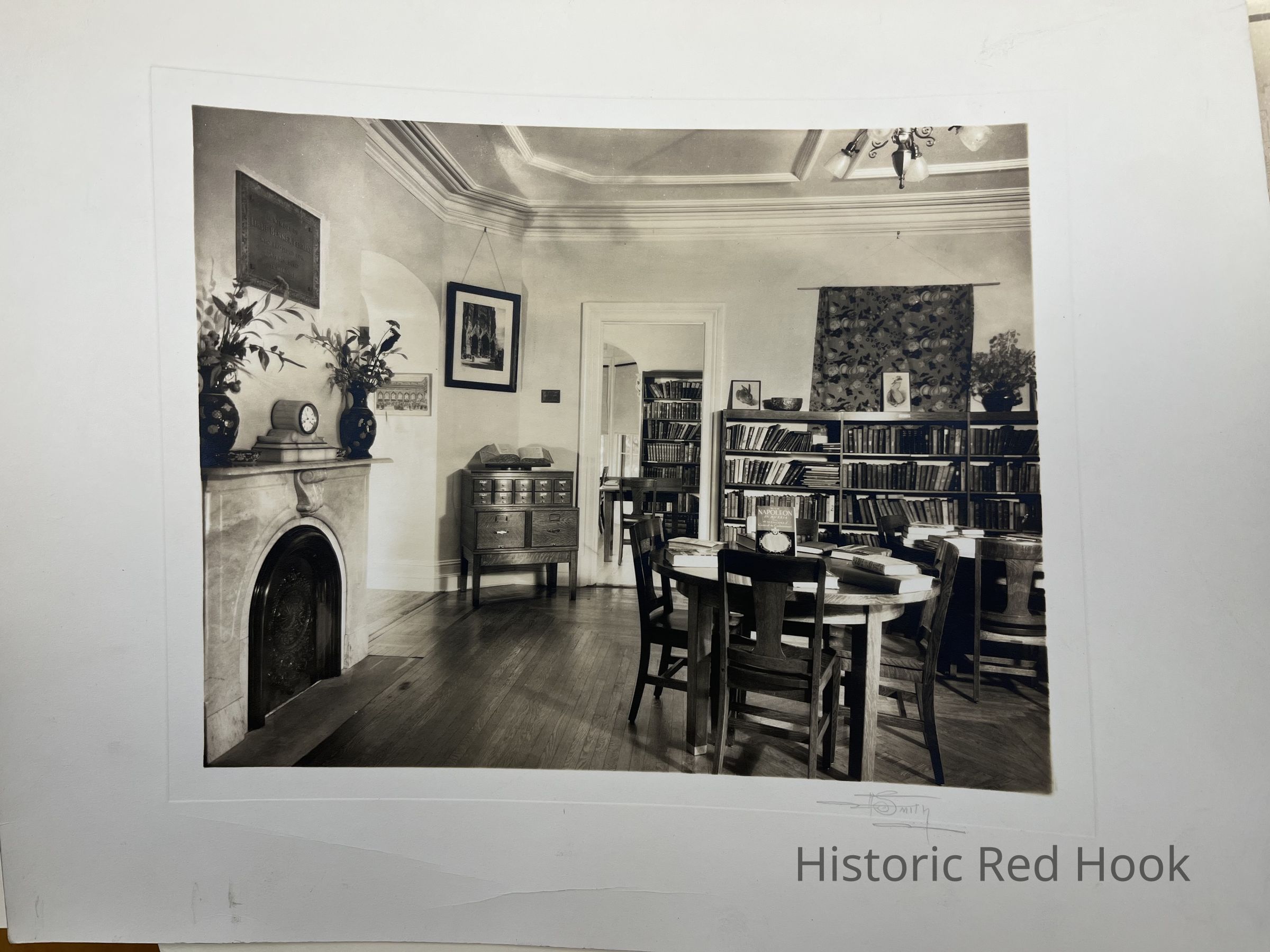 Sepia photos - two views of interior of Red Hook Library, circa 1930s. Signed I. Smith. Per Betsy Wacker " Library copies of prints indicate on back "Furniture by Gaylord'' May have been shot when libary opened in present building - November,1935. Name sign on desk reads "Mrs. Hallock" - she was librarian until 1949.Photograph Details