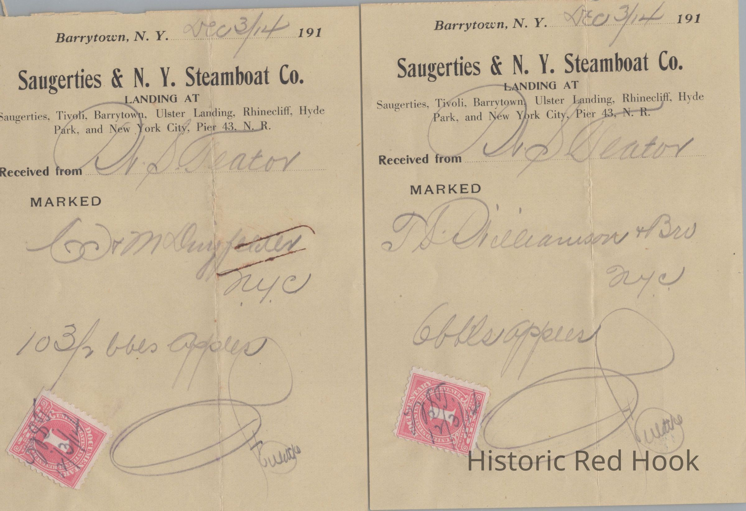 Teator Collection 1914 invoice from the Saugerties & New York Steamboat Co., Dr. for barrels of apples (2 invoices).Relationships