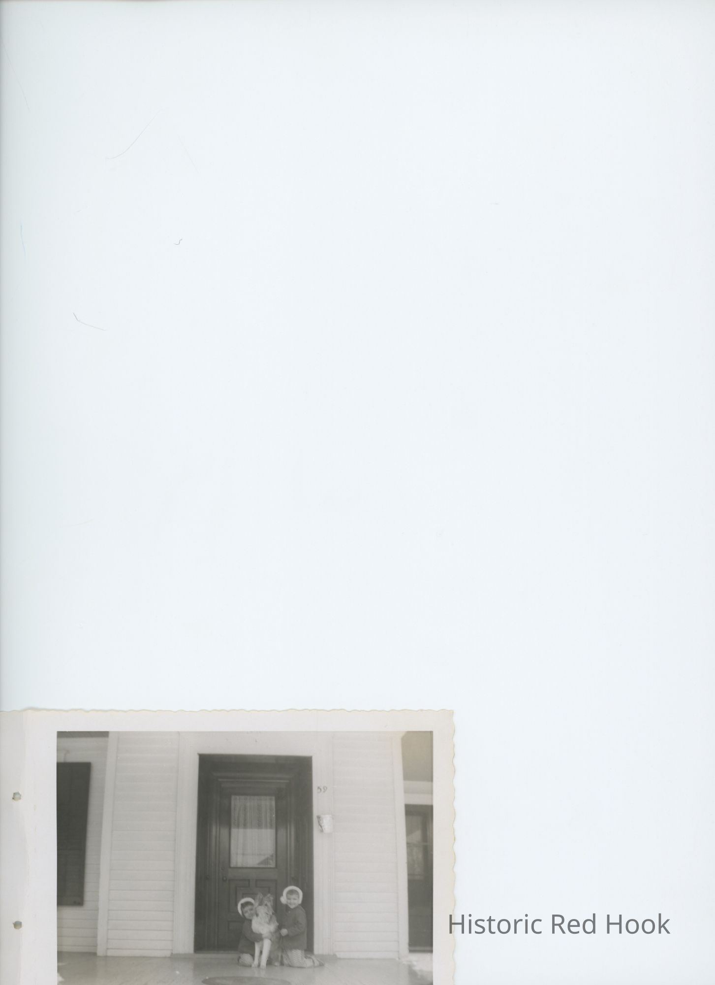 Digital photo of sisters Shelli and Tina Iraca, with dog "Shep", sitting on steps at 59 West Market Street, 1960Collection