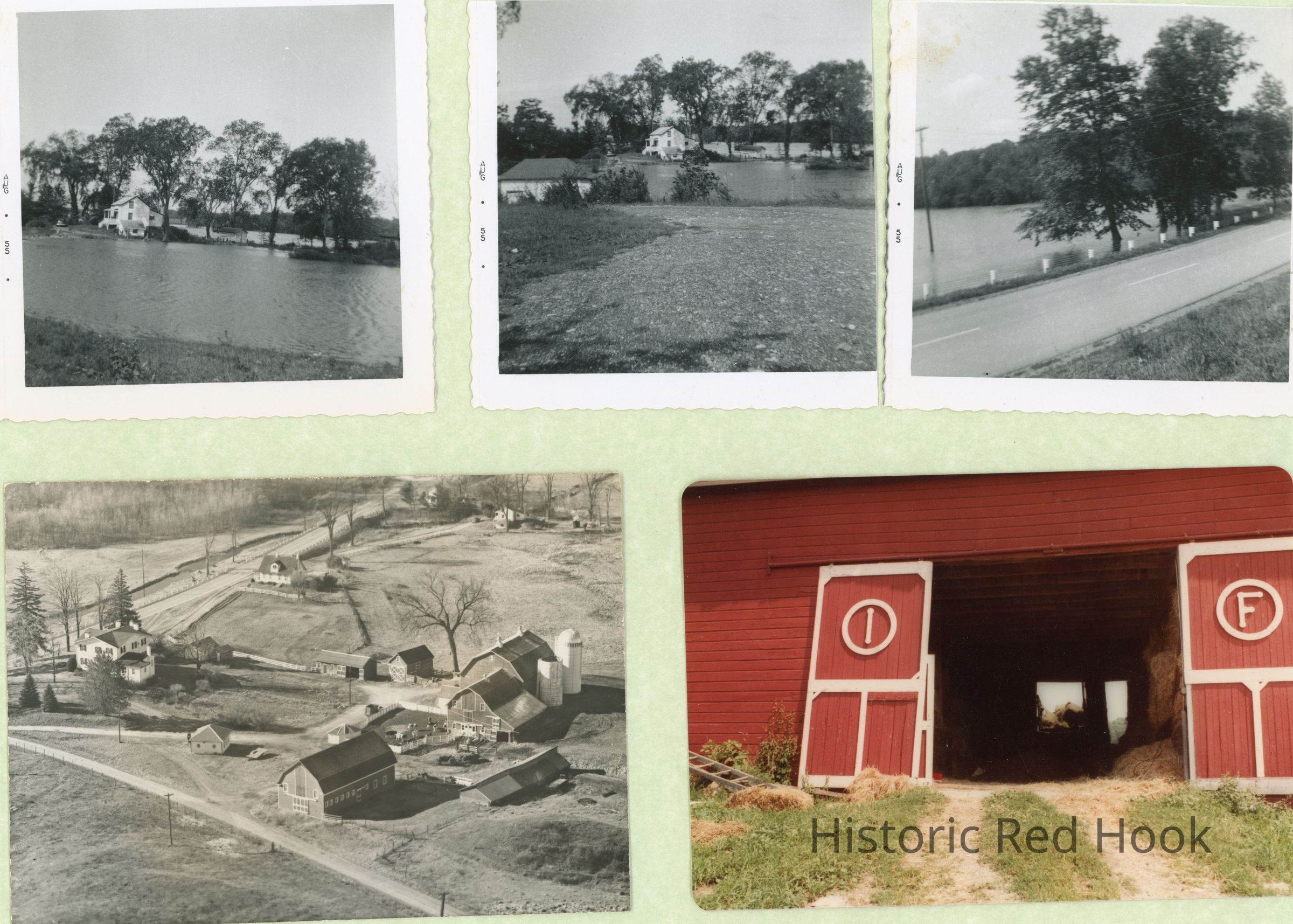 5 Irving Fraleigh farm photos, three showing 1955 flooding of field across Route 199 by Hurricane Carol