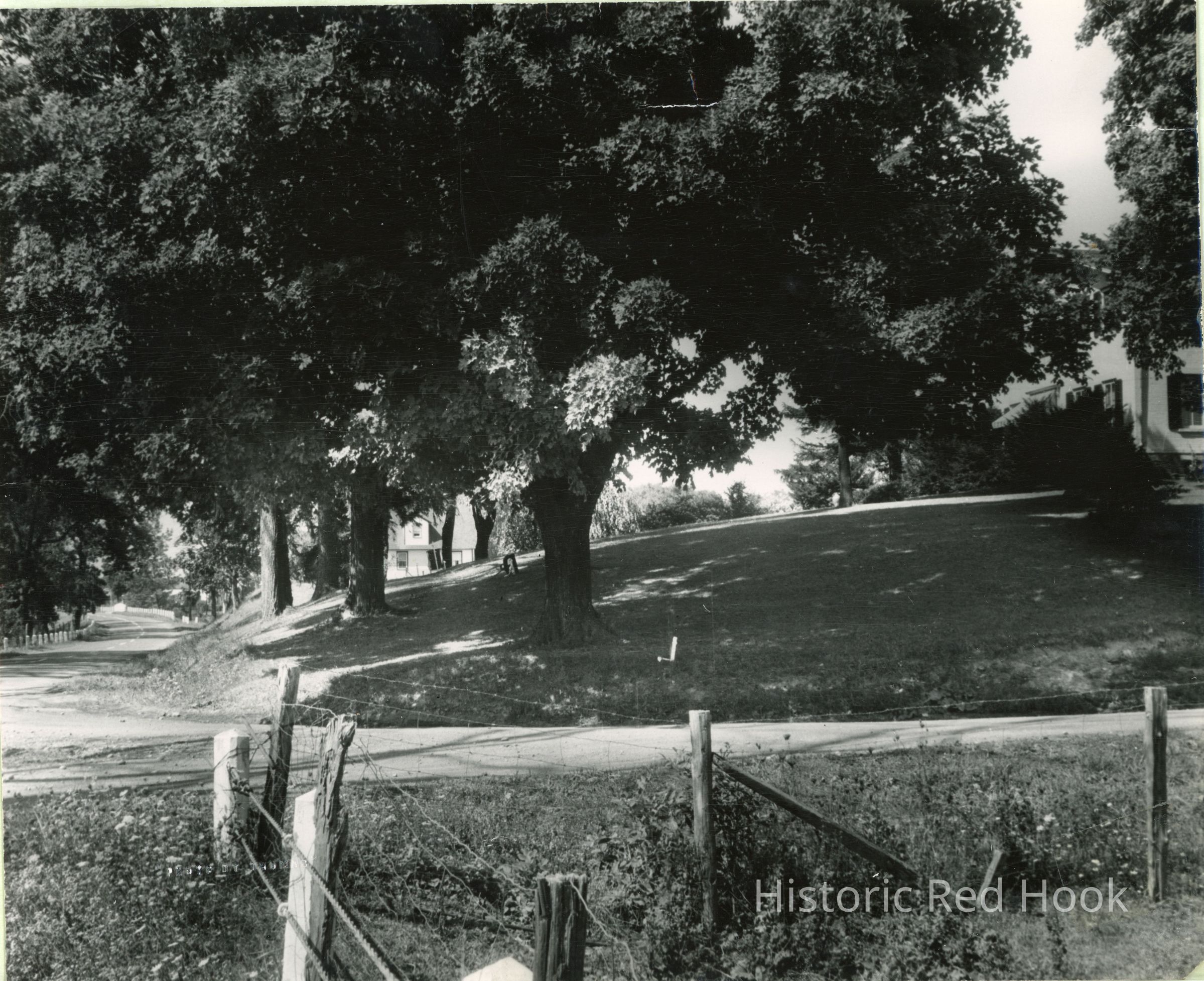 Black & white photo of Fraleigh farmhouse, looking west along Rt. 199 at the intersection of Crestwood Road